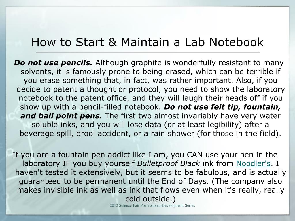 How to Start & Maintain a Lab Notebook Do not use pencils.Although graphite is wonderfully resistant to many solvents, it is famously prone to being erased, which can be terrible if you erase something that, in fact, was rather important. Also, if you decide to patent a thought or protocol, you need to show the laboratory notebook to the patent office, and they will laugh their heads off if you show up with a pencil-filled notebook. Do not use felt tip, fountain, and ball point pens.The first two almost invariably have very water soluble inks, and you will lose data (or at least legibility) after a beverage spill, drool accident, or a rain shower (for those in the field). If you are a fountain pen addict like I am, you CAN use your pen in the laboratory IF you buy yourself Bulletproof Black ink from Noodler's. I haven't tested it extensively, but it seems to be fabulous, and is actually guaranteed to be permanent until the End of Days. (The company also makes invisible ink as well as ink that flows even when it's really, really cold outside.) 2012 Science Fair Professional Development Series