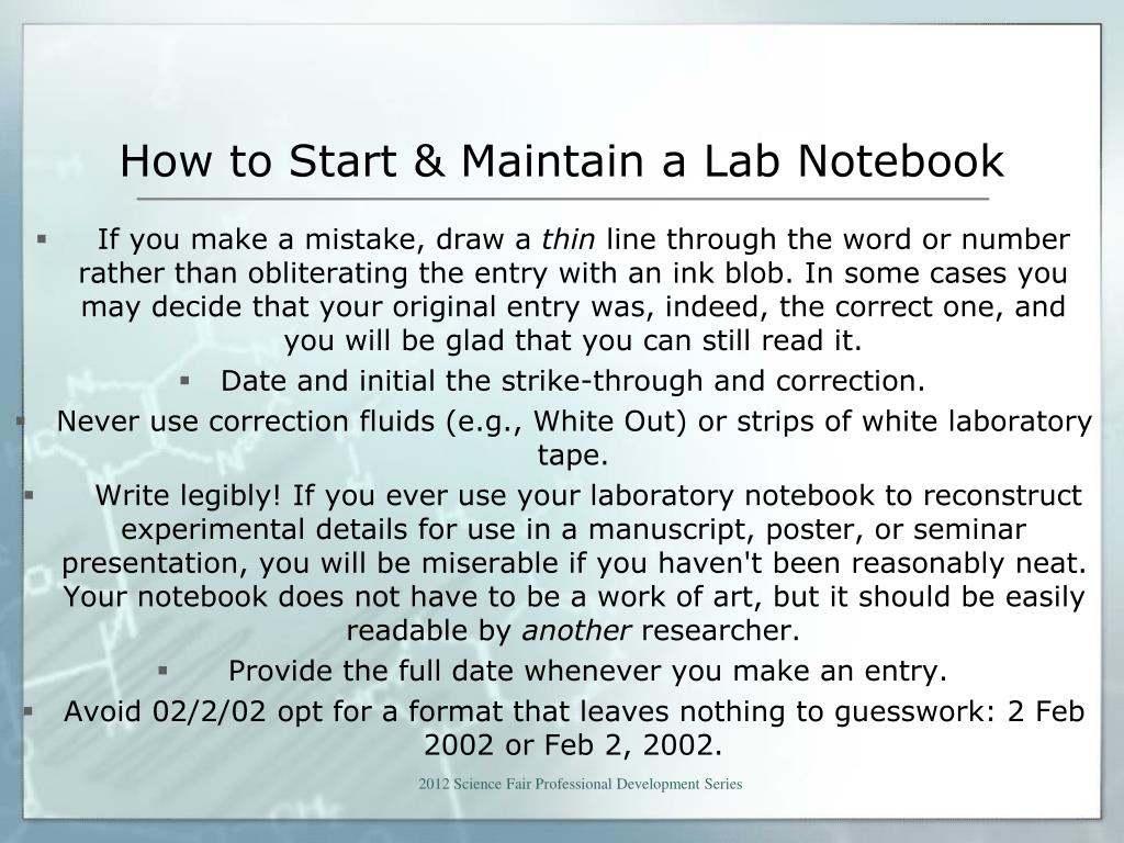 How to Start & Maintain a Lab Notebook • If you make a mistake, draw a thin line through the word or number rather than obliterating the entry with an ink blob. In some cases you may decide that your original entry was, indeed, the correct one, and you will be glad that you can still read it. • Date and initial the strike-through and correction. • Never use correction fluids (e.g., White Out) or strips of white laboratory tape. • Write legibly! If you ever use your laboratory notebook to reconstruct experimental details for use in a manuscript, poster, or seminar presentation, you will be miserable if you haven't been reasonably neat. Your notebook does not have to be a work of art, but it should be easily readable by another researcher. • Provide the full date whenever you make an entry. • Avoid 02/2/02 opt for a format that leaves nothing to guesswork: 2 Feb 2002 or Feb 2, 2002. 2012 Science Fair Professional Development Series