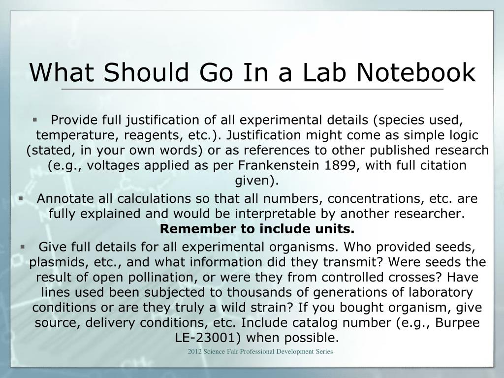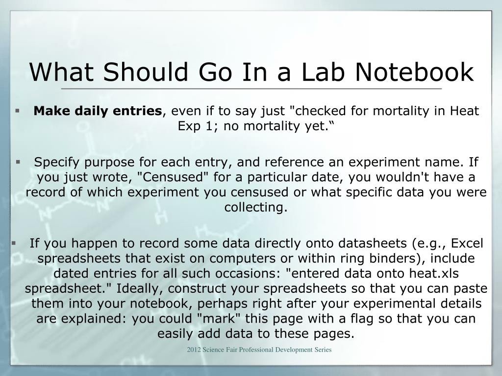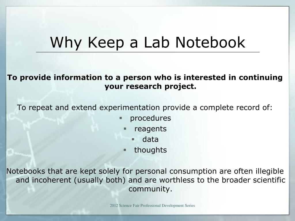 Why Keep a Lab Notebook To provide a complete record of why experiments were initiated and how they were performed. A notebook also provides a place to put: • the data that is collected • the statistical outcomes • graphs that are generated from analysis Practically speaking, researchers who distribute their efforts across multiple notebooks, computer files, 3-ring binders, Post-Its, and faulty brain cells are unlikely to be effective in the laboratory. 2012 Science Fair Professional Development Series
