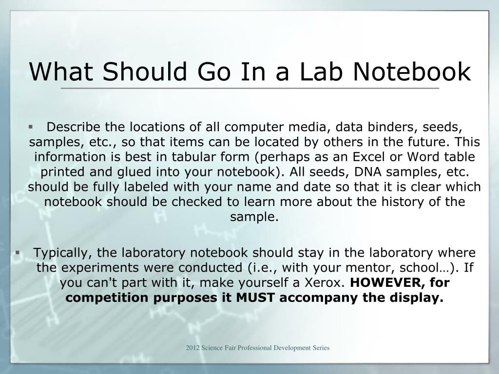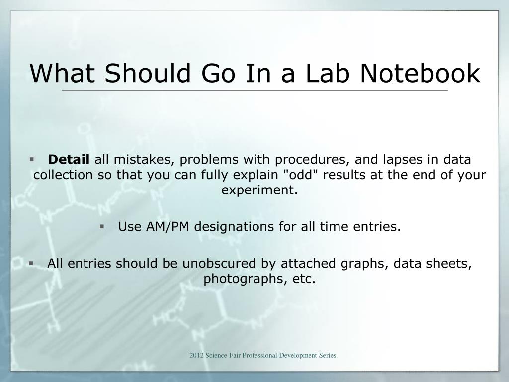 What Should Go In a Lab Notebook • Detail all mistakes, problems with procedures, and lapses in data collection so that you can fully explain "odd" results at the end of your experiment. • Use AM/PM designations for all time entries. • All entries should be unobscured by attached graphs, data sheets, photographs, etc. 2012 Science Fair Professional Development Series