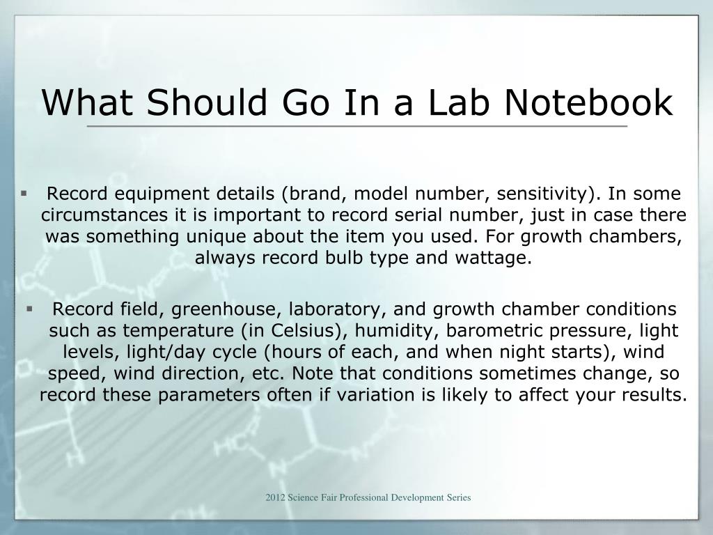 What Should Go In a Lab Notebook • Record equipment details (brand, model number, sensitivity). In some circumstances it is important to record serial number, just in case there was something unique about the item you used. For growth chambers, always record bulb type and wattage. • Record field, greenhouse, laboratory, and growth chamber conditions such as temperature (in Celsius), humidity, barometric pressure, light levels, light/day cycle (hours of each, and when night starts), wind speed, wind direction, etc. Note that conditions sometimes change, so record these parameters often if variation is likely to affect your results. 2012 Science Fair Professional Development Series