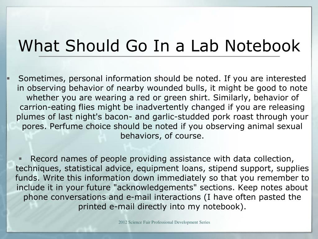What Should Go In a Lab Notebook • Sometimes, personal information should be noted. If you are interested in observing behavior of nearby wounded bulls, it might be good to note whether you are wearing a red or green shirt. Similarly, behavior of carrion-eating flies might be inadvertently changed if you are releasing plumes of last night's bacon- and garlic-studded pork roast through your pores. Perfume choice should be noted if you observing animal sexual behaviors, of course. • Record names of people providing assistance with data collection, techniques, statistical advice, equipment loans, stipend support, supplies funds. Write this information down immediately so that you remember to include it in your future "acknowledgements" sections. Keep notes about phone conversations and e-mail interactions (I have often pasted the printed e-mail directly into my notebook). 2012 Science Fair Professional Development Series