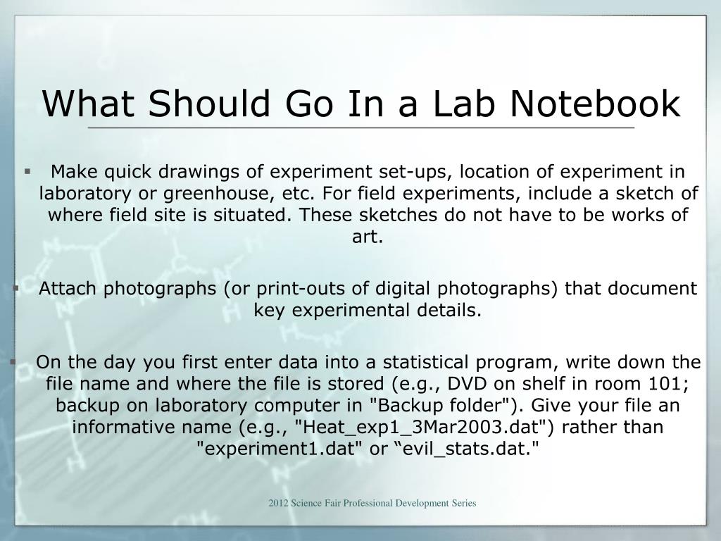 What Should Go In a Lab Notebook At the conclusion of your experiment, or at the end of your course, write or print out a full directory of all electronic files that relate to your experiment. For Macintosh users, you could buy DiskTracker (shareware) to produce a full directory tree of your folder (or whatever): save directory listing as text file, then import into Excel (or other editor). Within Excel, you can add a column of explanatory text so that is clear what each file contains. All files, including digital photographs, should have appropriate, informative names and be stored within a relevant folder (e.g., don't put all images into an "images" folder, but rather file them in the appropriate "experiment folder"). Delete all unneeded data files, blurry images, letters to home, etc.: the final storage disk (or burned CD) should contain only the important files. 2012 Science Fair Professional Development Series