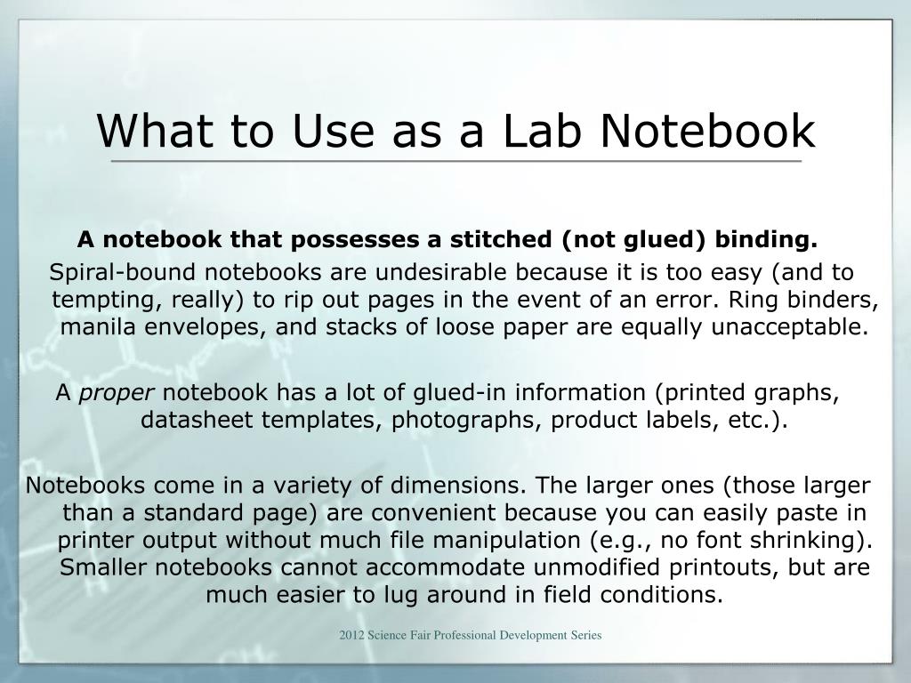What to Use as a Lab Notebook A notebook that possesses a stitched (not glued) binding. Spiral-bound notebooks are undesirable because it is too easy (and to tempting, really) to rip out pages in the event of an error. Ring binders, manila envelopes, and stacks of loose paper are equally unacceptable. A proper notebook has a lot of glued-in information (printed graphs, datasheet templates, photographs, product labels, etc.). Notebooks come in a variety of dimensions. The larger ones (those larger than a standard page) are convenient because you can easily paste in printer output without much file manipulation (e.g., no font shrinking). Smaller notebooks cannot accommodate unmodified printouts, but are much easier to lug around in field conditions. 2012 Science Fair Professional Development Series