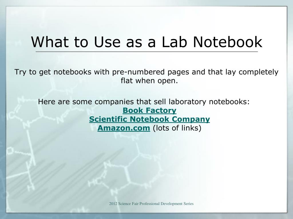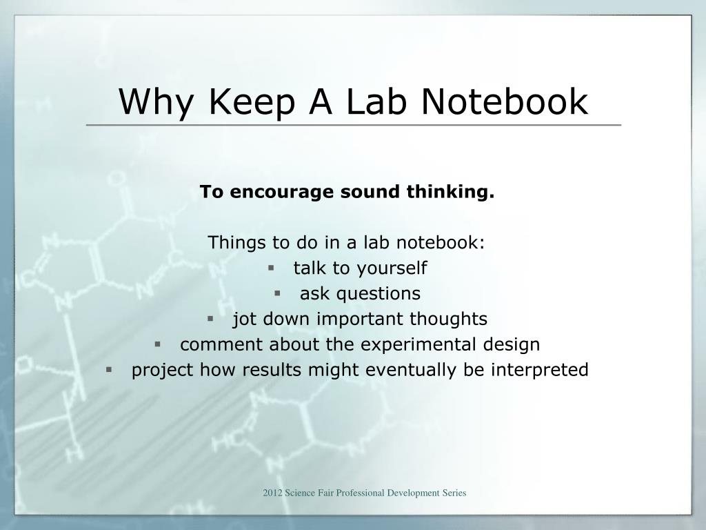Why Keep A Lab Notebook To encourage sound thinking. Things to do in a lab notebook: • talk to yourself • ask questions • jot down important thoughts • comment about the experimental design • project how results might eventually be interpreted 2012 Science Fair Professional Development Series