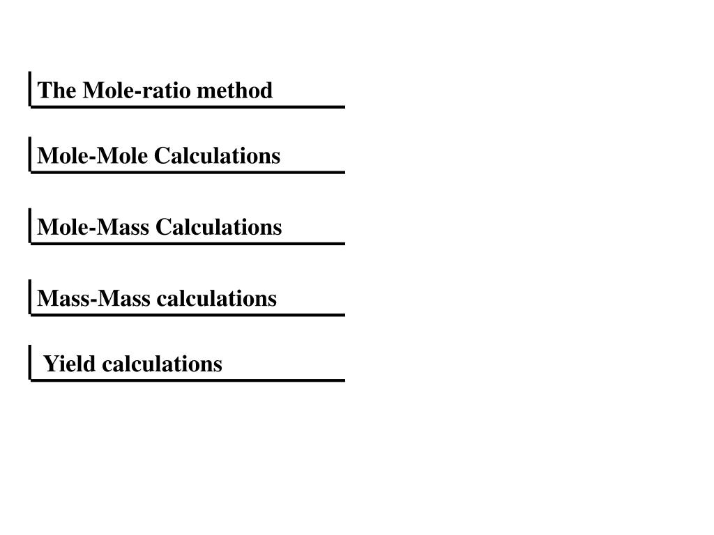 The Mole-ratio method Mole-Mole Calculations Mole-Mass Calculations Mass-Mass calculations Yield calculations