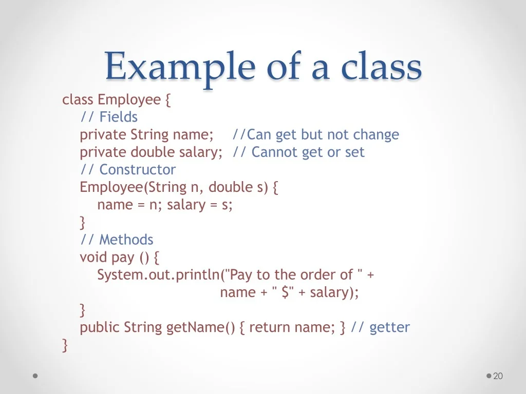 Example of a class class Employee { // Fields private String name; //Can get but not change private double salary; // Cannot get or set// Constructor Employee(String n, double s) { name = n; salary = s; }// Methods void pay () { System.out.println("Pay to the order of " + name + " $" + salary); } public String getName() { return name; } // getter }