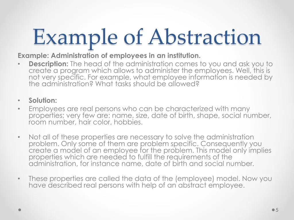 Example of Abstraction Example: Administration of employees in an institution. • Description: The head of the administration comes to you and ask you to create a program which allows to administer the employees. Well, this is not very specific. For example, what employee information is needed by the administration? What tasks should be allowed? • Solution: • Employees are real persons who can be characterized with many properties; very few are: name, size, date of birth, shape, social number, room number, hair color, hobbies. • Not all of these properties are necessary to solve the administration problem. Only some of them are problem specific. Consequently you create a model of an employee for the problem. This model only implies properties which are needed to fulfill the requirements of the administration, for instance name, date of birth and social number. • These properties are called the data of the (employee) model. Now you have described real persons with help of an abstract employee.