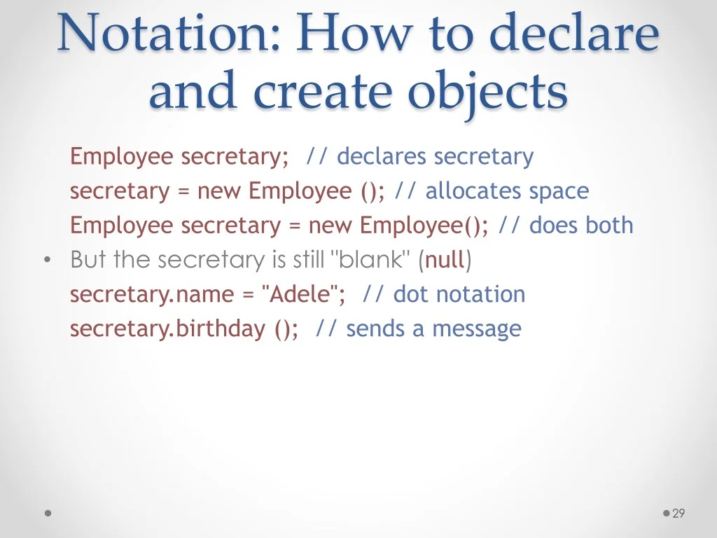 Notation: How to declare and create objects • Employee secretary; // declares secretary • secretary = new Employee ();// allocates space • Employee secretary = new Employee(); // does both • But the secretary is still "blank" (null) • secretary.name = "Adele";// dot notation • secretary.birthday (); // sends a message