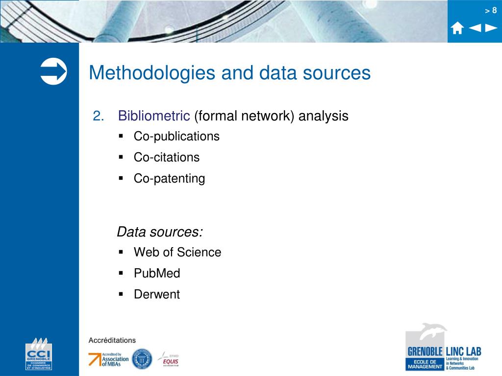 Methodologies and data sources • Bibliometric (formal network) analysis • Co-publications • Co-citations • Co-patenting Data sources: • Web of Science • PubMed • Derwent