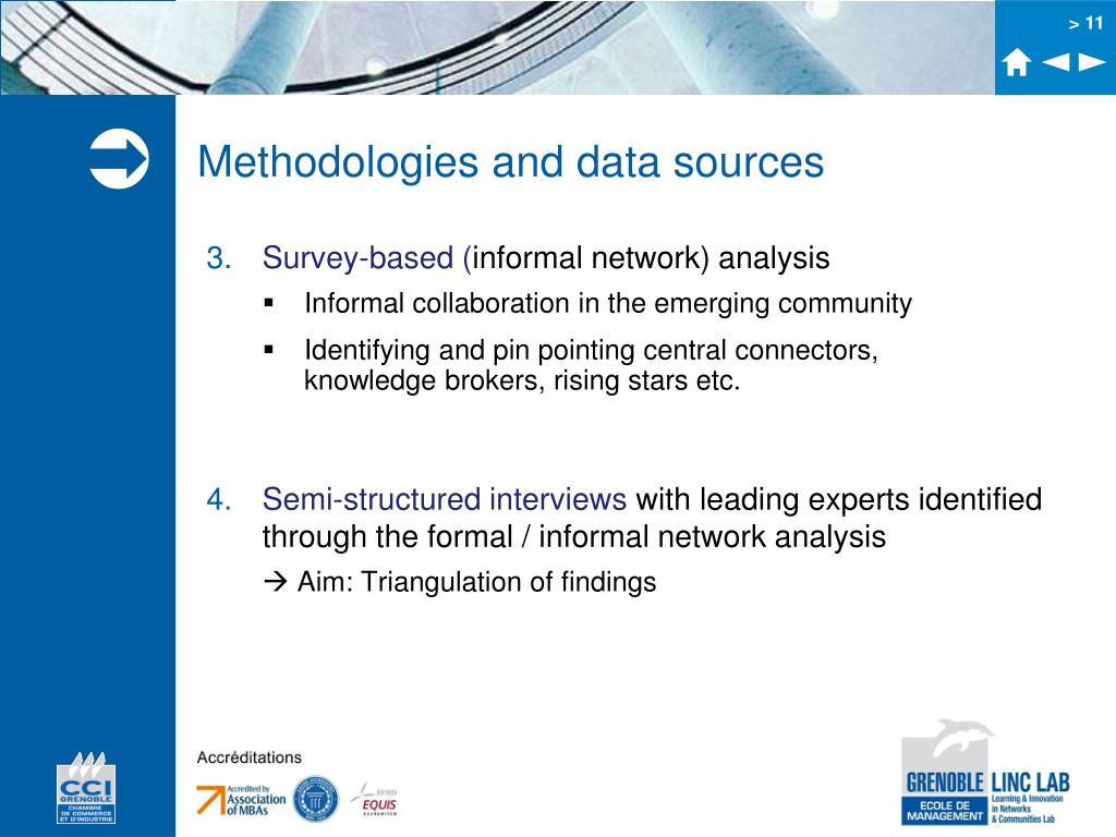 Methodologies and data sources • Survey-based (informalnetwork) analysis • Informal collaboration in the emerging community • Identifying and pin pointing central connectors, knowledge brokers, rising stars etc. • Semi-structured interviews with leading experts identified through the formal / informal network analysis • Aim: Triangulation of findings