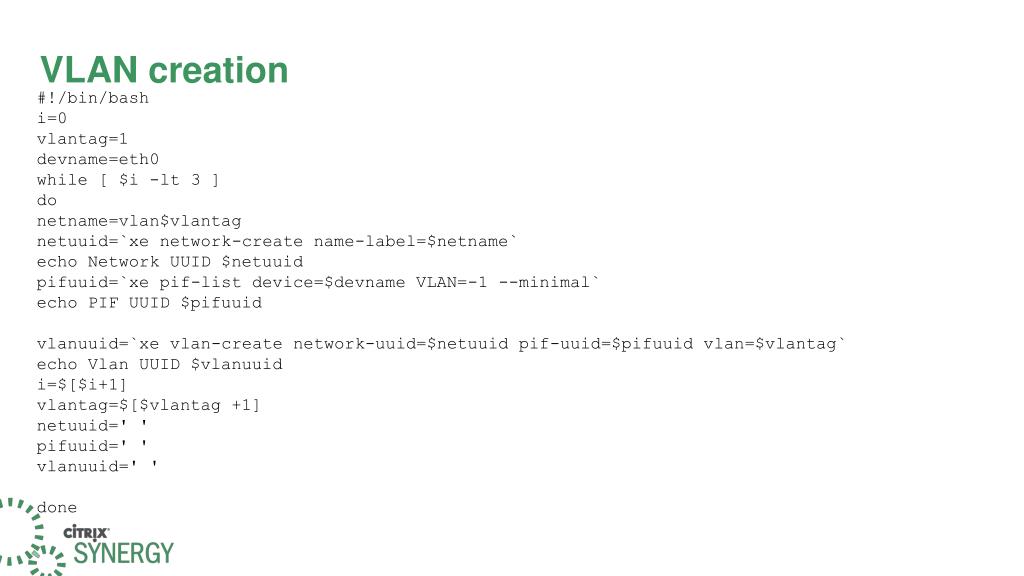VLAN creation #!/bin/bash i=0 vlantag=1 devname=eth0 while [ $i -lt 3 ] do netname=vlan$vlantag netuuid=`xe network-create name-label=$netname` echo Network UUID $netuuid pifuuid=`xe pif-list device=$devname VLAN=-1 --minimal` echo PIF UUID $pifuuid vlanuuid=`xe vlan-create network-uuid=$netuuid pif-uuid=$pifuuid vlan=$vlantag` echo Vlan UUID $vlanuuid i=$[$i+1] vlantag=$[$vlantag +1] netuuid=' ' pifuuid=' ' vlanuuid=' ' done