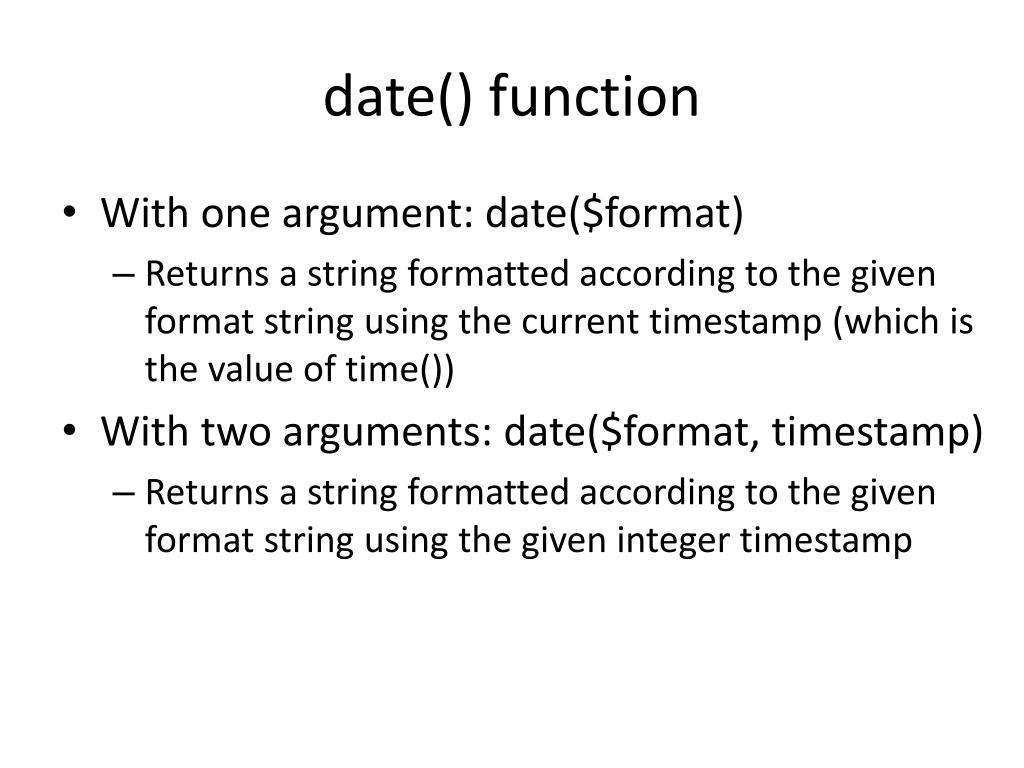 date() function • With one argument: date($format) • Returns a string formatted according to the given format string using the current timestamp (which is the value of time()) • With two arguments: date($format, timestamp) • Returns a string formatted according to the given format string using the given integer timestamp