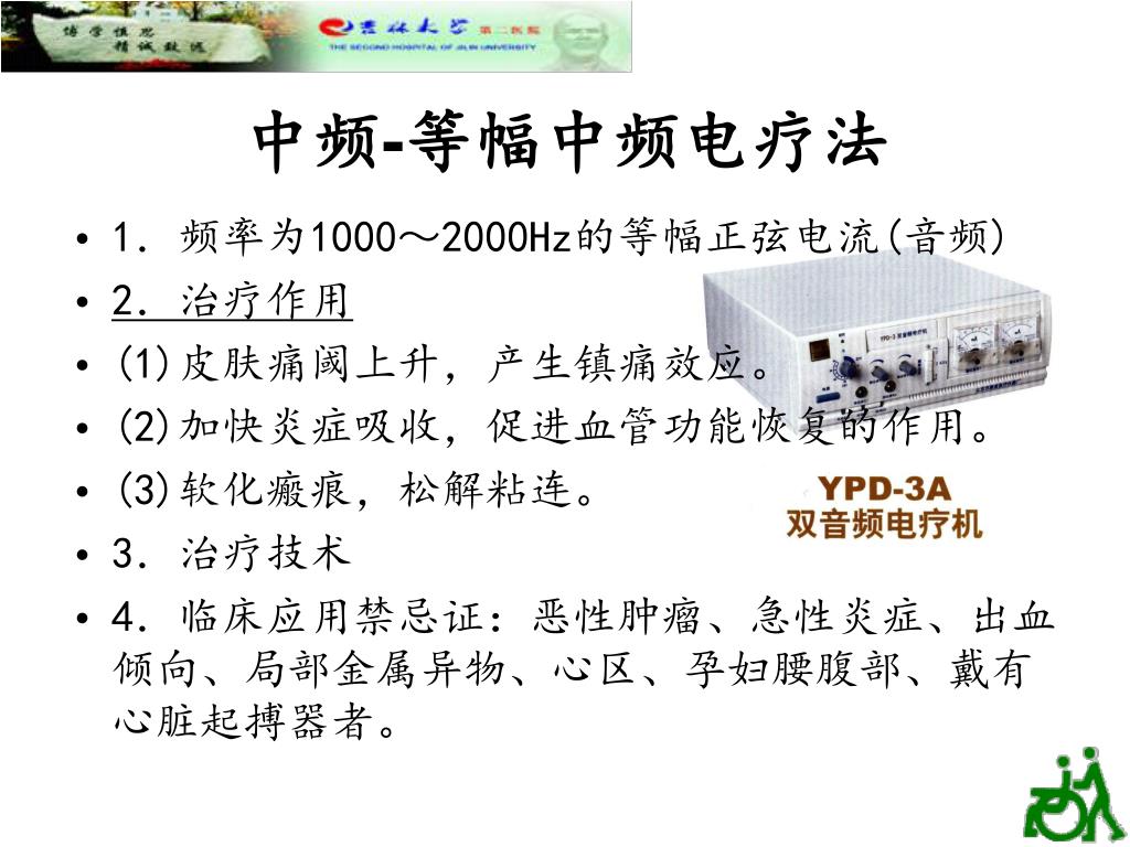 中频-等幅中频电疗法 • 1.频率为1000~2000Hz的等幅正弦电流(音频) • 2.治疗作用 • (1)皮肤痛阈上升,产生镇痛效应。 • (2)加快炎症吸收,促进血管功能恢复的作用。 • (3)软化瘢痕,松解粘连。 • 3.治疗技术 • 4.临床应用禁忌证:恶性肿瘤、急性炎症、出血倾向、局部金属异物、心区、孕妇腰腹部、戴有心脏起搏器者。