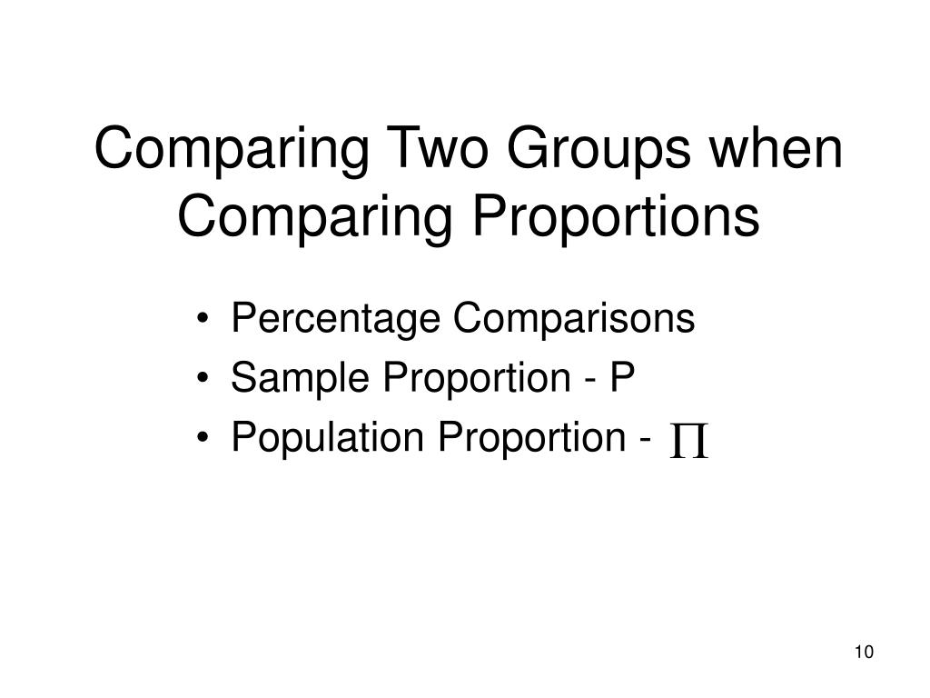 Comparing Two Groups when Comparing Proportions • Percentage Comparisons • Sample Proportion - P • Population Proportion -