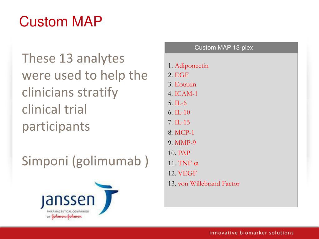 Custom MAP Custom MAP 13-plex • These 13 analytes were used to help the clinicians stratify clinical trial participants • Simponi (golimumab ) 1. Adiponectin 2. EGF 3. Eotaxin 4. ICAM-1 5. IL-6 6. IL-10 7.IL-15 8.MCP-1 9.MMP-9 10.PAP 11.TNF-a 12.VEGF 13.von Willebrand Factor