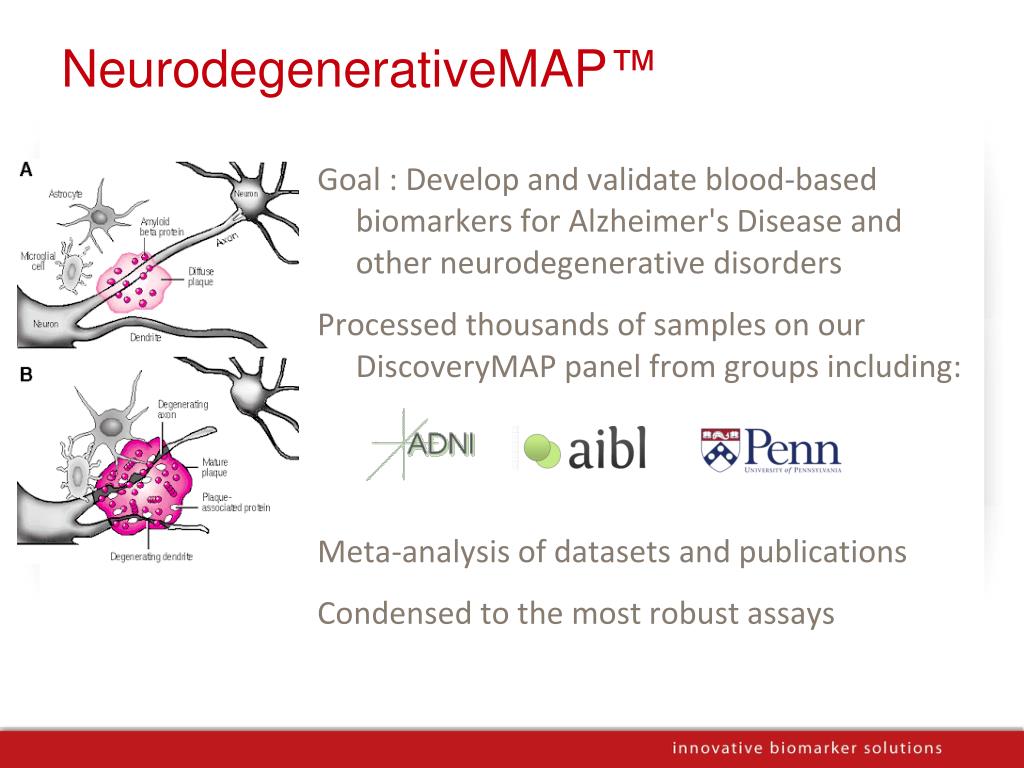 NeurodegenerativeMAP™ • Goal : Develop and validate blood-based biomarkers for Alzheimer's Disease and other neurodegenerative disorders • Processed thousands of samples on our DiscoveryMAP panel from groups including: • Meta-analysis of datasets and publications • Condensed to the most robust assays