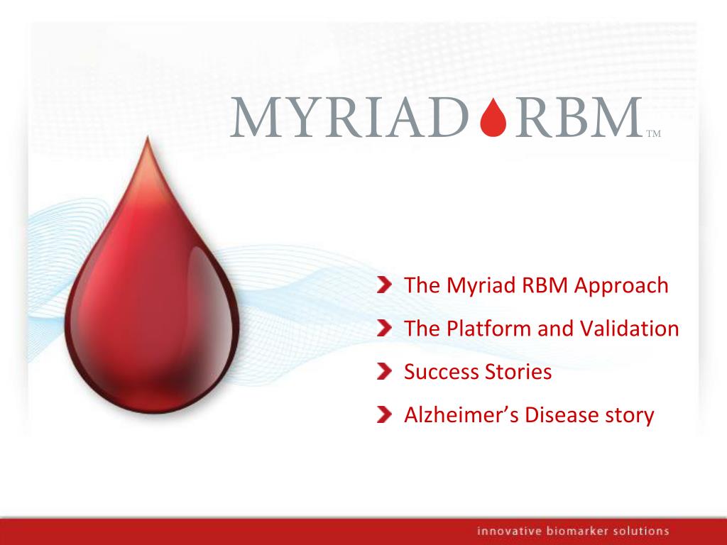 Blood-based Biomarkers for Detection of early stage Alzheimer’s Disease: A Successful Multi-Analyte Profiling Approach. Ralph L. McDade, Ph.D. Strategic Development Officer. The Myriad RBM Approach The Platform and Validation Success Stories Alzheimer’s Disease story.