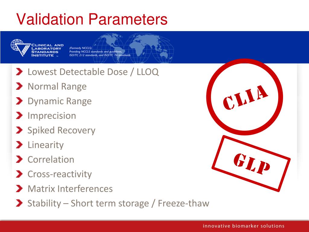 Validation Parameters • Lowest Detectable Dose / LLOQ • Normal Range • Dynamic Range • Imprecision • Spiked Recovery • Linearity • Correlation • Cross-reactivity • Matrix Interferences • Stability – Short term storage / Freeze-thaw CLIA GLP