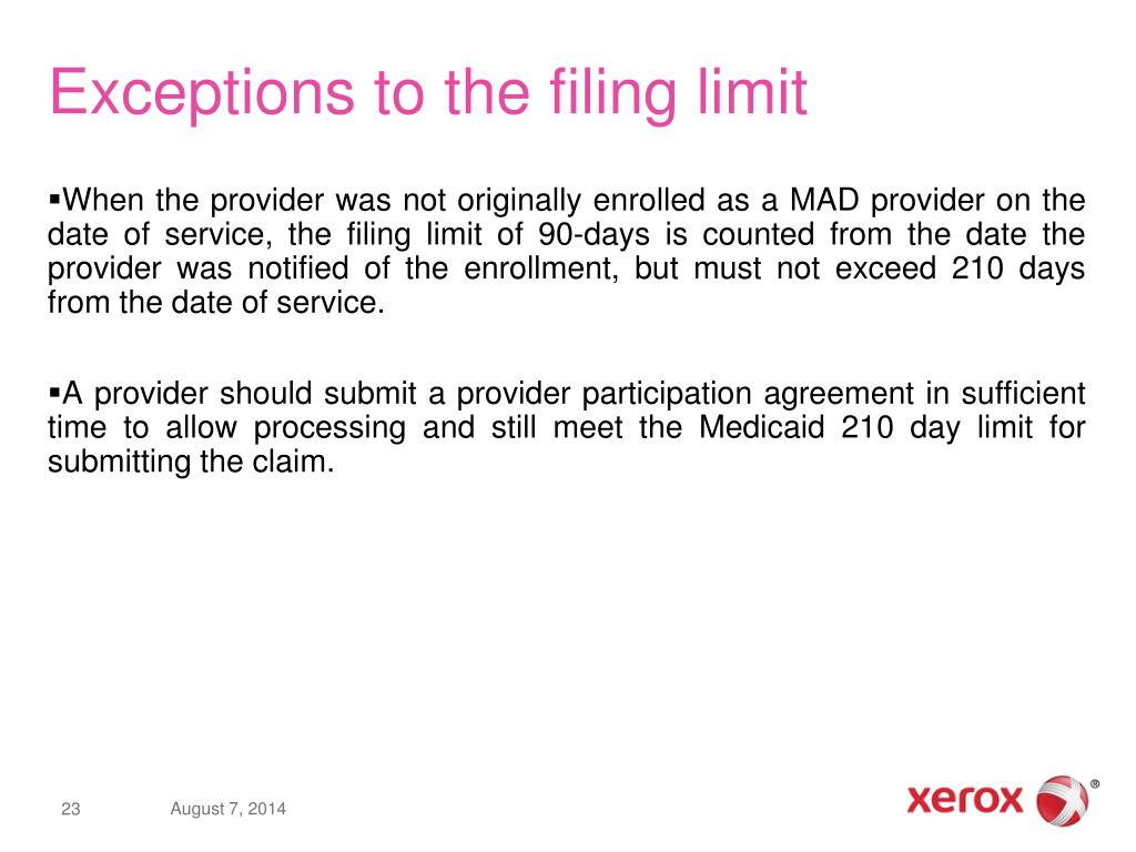 Exceptions to the filing limit • When the provider was not originally enrolled as a MAD provider on the date of service, the filing limit of 90-days is counted from the date the provider was notified of the enrollment, but must not exceed 210 days from the date of service. • A provider should submit a provider participation agreement in sufficient time to allow processing and still meet the Medicaid 210 day limit for submitting the claim.
