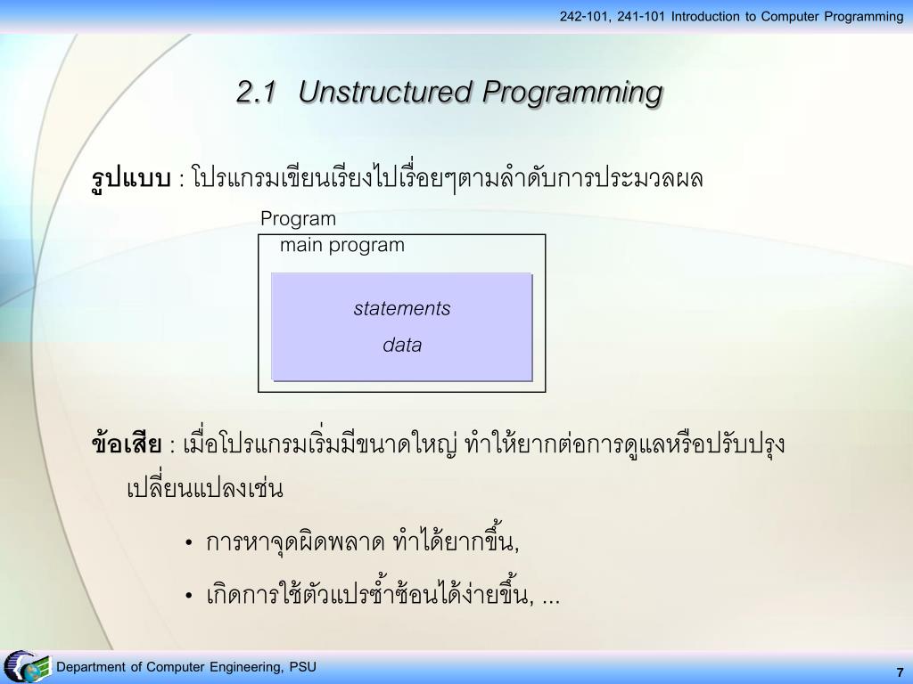 Program statements data 2.1 Unstructured Programming รูปแบบ : โปรแกรมเขียนเรียงไปเรื่อยๆตามลำดับการประมวลผล ข้อเสีย : เมื่อโปรแกรมเริ่มมีขนาดใหญ่ ทำให้ยากต่อการดูแลหรือปรับปรุงเปลี่ยนแปลงเช่น • การหาจุดผิดพลาด ทำได้ยากขึ้น, • เกิดการใช้ตัวแปรซ้ำซ้อนได้ง่ายขึ้น, ... main program