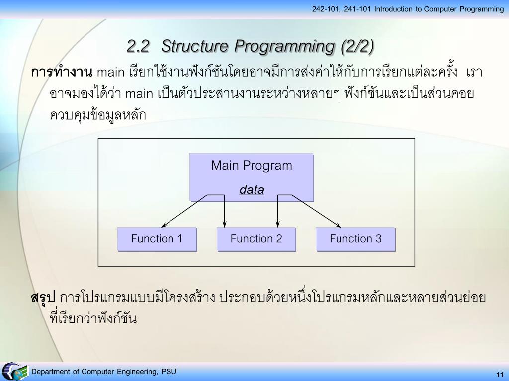 Program main program function ลำดับการทำงาน จุดที่เรียกใช้งาน 2.2 Structural Programming (1/2) รูปแบบ : นำชุดคำสั่งบางส่วนไปรวบรวมไว้ในฟังก์ชัน โปรแกรมหลัก(mainprogram) ซึ่งเป็นส่วนที่เริ่มการทำงานของโปรแกรม จะเรียกใช้ชุดคำสั่งในฟังก์ชันนั้นมาทำงาน ข้อดี : • มีการซ่อนรายละเอียดซับซ้อนไว้ในฟังก์ชัน ทำให้โปรแกรมหลักง่ายในการทำความเข้าใจ • ลดความซ้ำซ้อนของส่วนโปรแกรมที่เหมือนๆกันไว้ในฟังก์ชันเดียวกัน • การหาข้อผิดพลาดของโปรแกรมง่ายขึ้น โดยแยกหาระหว่างส่วน main กับฟังก์ชันอื่นๆ