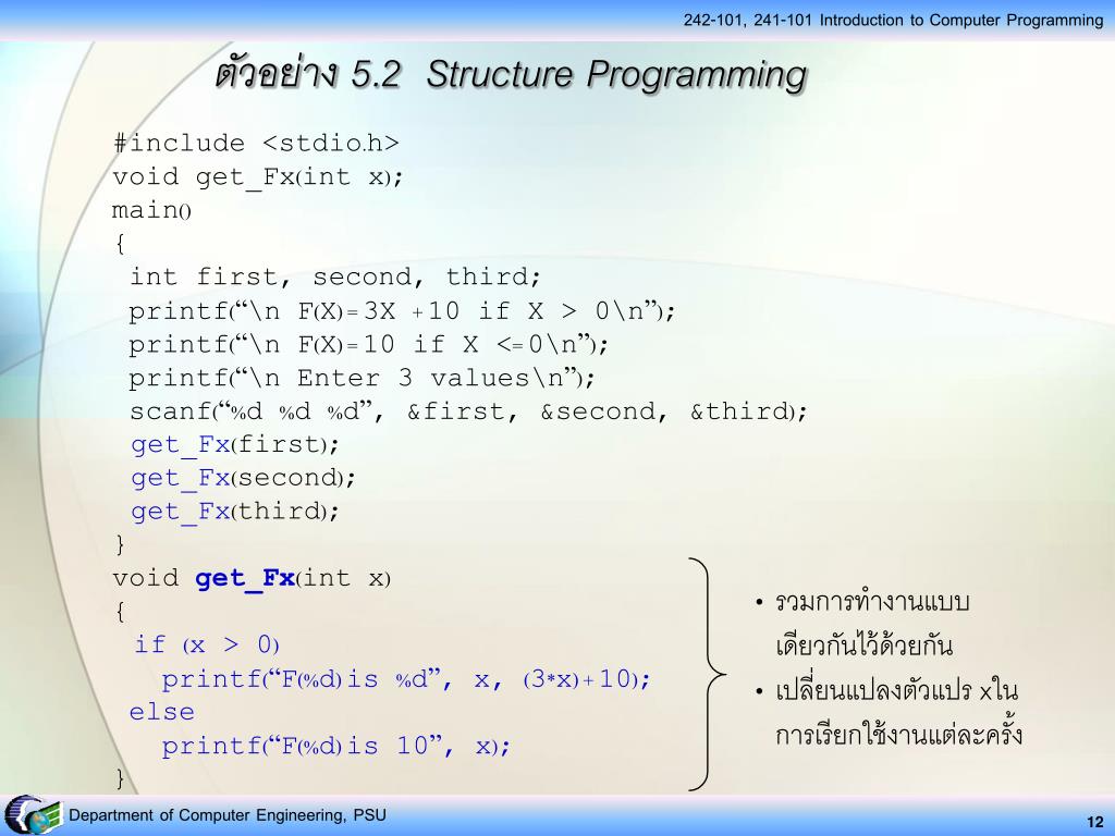 ตัวอย่าง 5.2 Structure Programming #include <stdio.h> void get_Fx(int x); main() { int first, second, third; printf(“\n F(X) = 3X + 10 if X > 0\n”); printf(“\n F(X) = 10 if X <= 0\n”); printf(“\n Enter 3 values\n”); scanf(“%d %d %d”, &first, &second, &third); get_Fx(first); get_Fx(second); get_Fx(third); } void get_Fx(int x) { if (x > 0) printf(“F(%d) is %d”, x, (3*x) + 10); else printf(“F(%d) is 10”, x); } • รวมการทำงานแบบเดียวกันไว้ด้วยกัน • เปลี่ยนแปลงตัวแปร xในการเรียกใช้งานแต่ละครั้ง