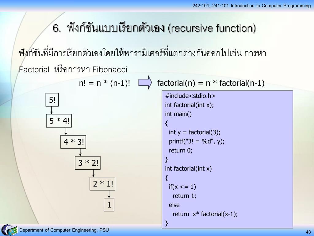 n! = n * (n-1)! factorial(n) = n * factorial(n-1) 5! 5 * 4! 4 * 3! 3 * 2! 2 * 1! 1 6. ฟังก์ชันแบบเรียกตัวเอง (recursive function) ฟังก์ชันที่มีการเรียกตัวเองโดยให้พารามิเตอร์ที่แตกต่างกันออกไปเช่น การหา Factorial หรือการหา Fibonacci #include<stdio.h> int factorial(int x); int main() { int y = factorial(3); printf("3! = %d“, y); return 0; } int factorial(int x) { if(x <= 1) return 1; else return x* factorial(x-1); }