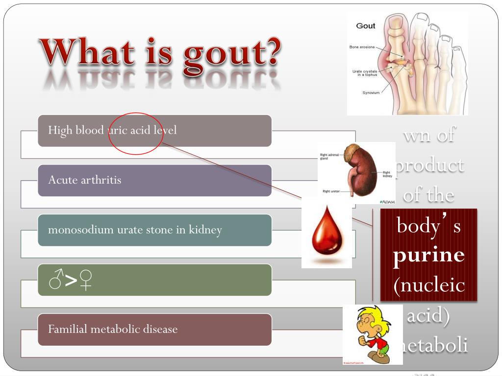 What is gout? Breakdown of product of the body’s purine (nucleic acid) metabolism.