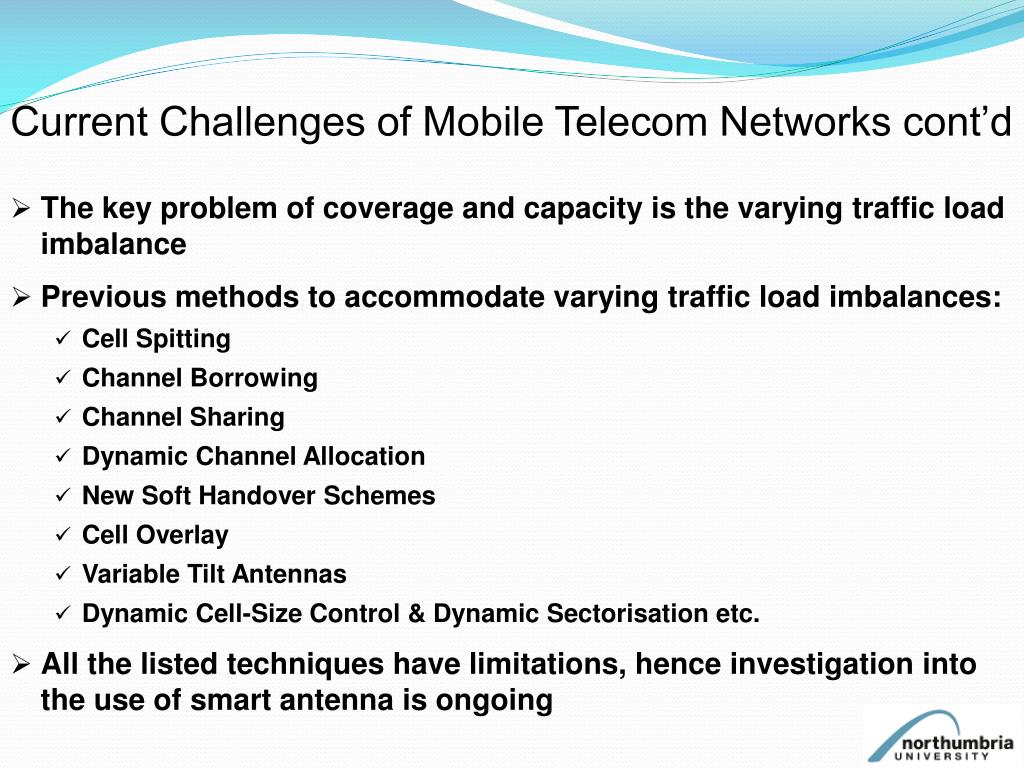 Current Challenges of Mobile Telecom Networks cont’d • The key problem of coverage and capacity is the varying traffic load imbalance • Previous methods to accommodate varying traffic load imbalances: • Cell Spitting • Channel Borrowing • Channel Sharing • Dynamic Channel Allocation • New Soft Handover Schemes • Cell Overlay • Variable Tilt Antennas • Dynamic Cell-Size Control & Dynamic Sectorisation etc. • All the listed techniques have limitations, hence investigation into the use of smart antenna is ongoing