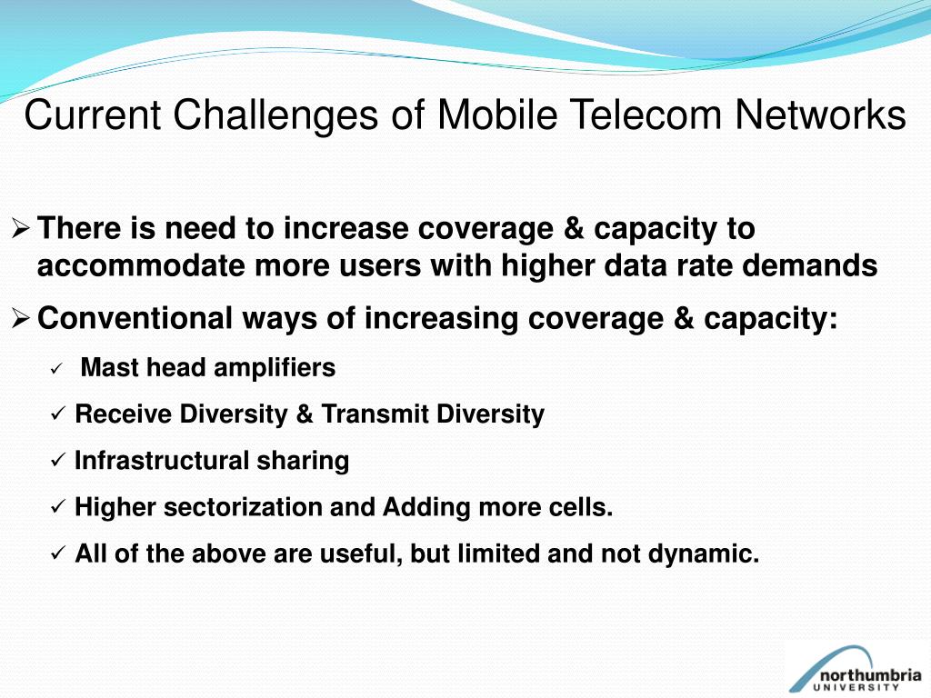 Current Challenges of Mobile Telecom Networks • There is need to increase coverage & capacity to accommodate more users with higher data rate demands • Conventional ways of increasing coverage & capacity: • Mast head amplifiers • Receive Diversity & Transmit Diversity • Infrastructural sharing • Higher sectorization and Adding more cells. • All of the above are useful, but limited and not dynamic.