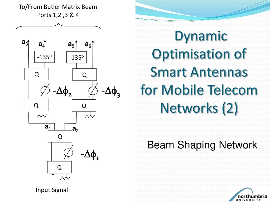To/From Butler Matrix Beam Ports 1,2 ,3 & 4 -135o -135o Q Q Q Q Q Q Input Signal Dynamic Optimisation of Smart Antennasfor Mobile Telecom Networks (2) a3 a4 a5 a6 -2 -3 a1 a2 Beam Shaping Network -1