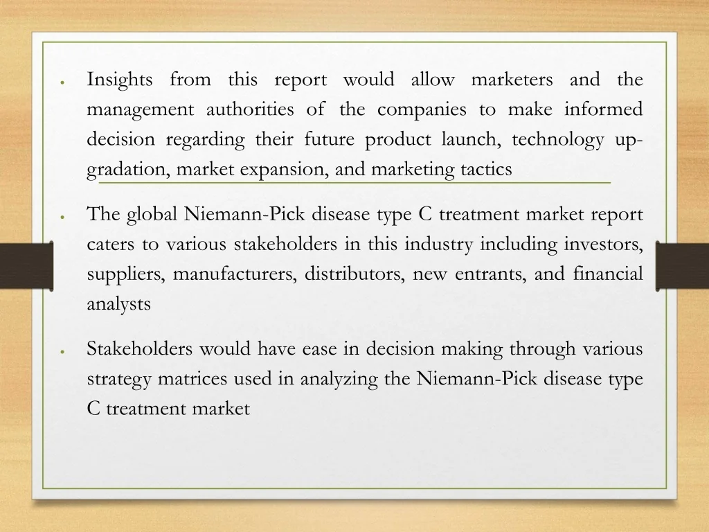 Insights from this report would allow marketers and the management authorities of the companies to make informed decision regarding their future product launch, technology up-gradation, market expansion, and marketing tactics • The global Niemann-Pick disease type C treatment market report caters to various stakeholders in this industry including investors, suppliers, manufacturers, distributors, new entrants, and financial analysts • Stakeholders would have ease in decision making through various strategy matrices used in analyzing the Niemann-Pick disease type C treatment market