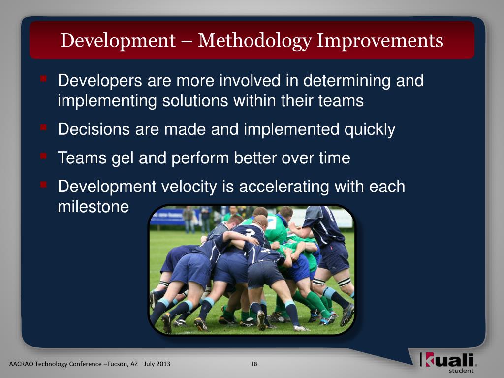 Development – Methodology Improvements • Developers are more involved in determining and implementing solutions within their teams • Decisions are made and implemented quickly • Teams gel and perform better over time • Development velocity is accelerating with each milestone AACRAO Technology Conference –Tucson, AZ July 2013
