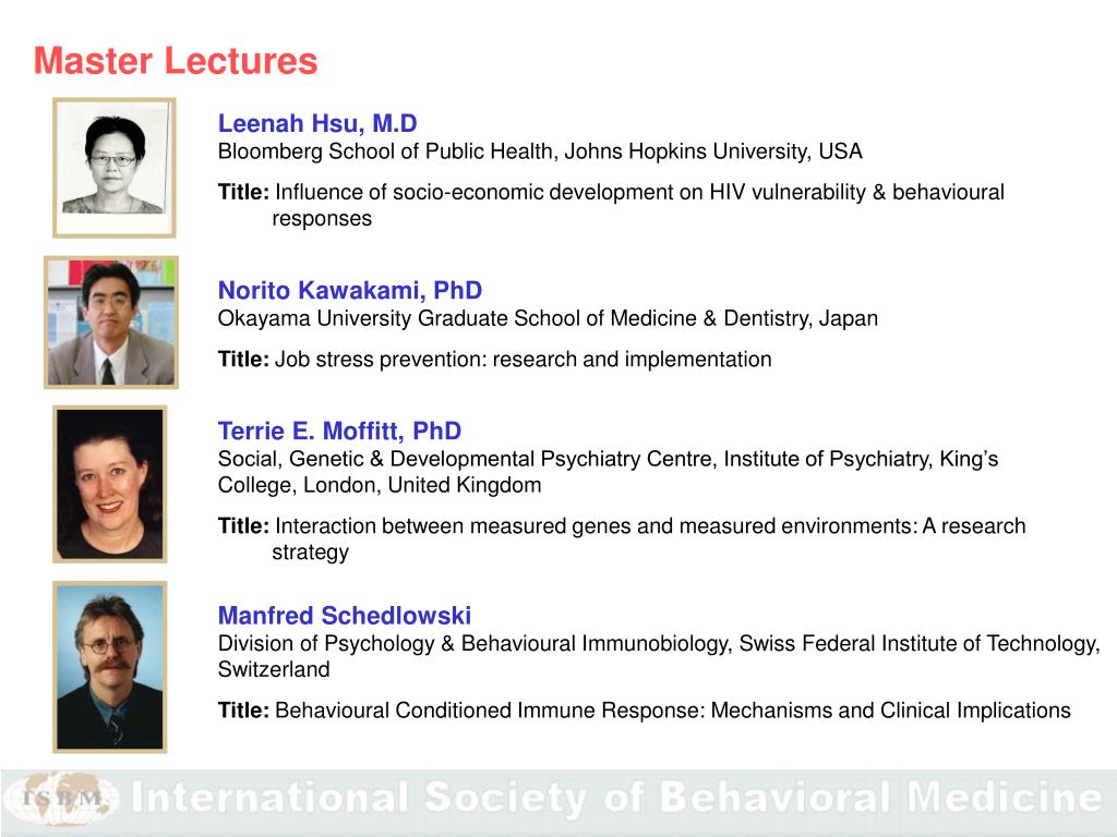 Leenah Hsu, M.D Bloomberg School of Public Health, Johns Hopkins University, USA Title: Influence of socio-economic development on HIV vulnerability & behavioural responses Norito Kawakami, PhD Okayama University Graduate School of Medicine & Dentistry, Japan Title: Job stress prevention: research and implementation Terrie E. Moffitt, PhD Social, Genetic & Developmental Psychiatry Centre, Institute of Psychiatry, King’s College, London, United Kingdom Title: Interaction between measured genes and measured environments: A research strategy Manfred Schedlowski Division of Psychology & Behavioural Immunobiology, Swiss Federal Institute of Technology, Switzerland Title: Behavioural Conditioned Immune Response: Mechanisms and Clinical Implications Master Lectures
