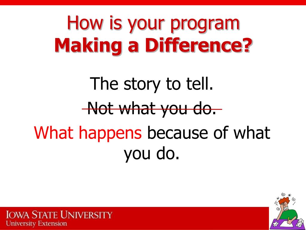 How is your program Making a Difference? The story to tell. Not what you do. What happens because of what you do.