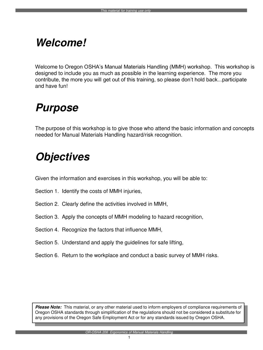 Welcome! Welcome to Oregon OSHA’s Manual Materials Handling (MMH) workshop. This workshop is designed to include you as much as possible in the learning experience. The more you contribute, the more you will get out of this training, so please don’t hold back...participate and have fun! Purpose The purpose of this workshop is to give those who attend the basic information and concepts needed for Manual Materials Handling hazard/risk recognition. Objectives Given the information and exercises in this workshop, you will be able to: Section 1. Identify the costs of MMH injuries, Section 2. Clearly define the activities involved in MMH, Section 3. Apply the concepts of MMH modeling to hazard recognition, Section 4. Recognize the factors that influence MMH, Section 5. Understand and apply the guidelines for safe lifting, Section 6. Return to the workplace and conduct a basic survey of MMH risks. Please Note: This material, or any other material used to inform employers of compliance requirements of Oregon OSHA standards through simplification of the regulations should not be considered a substitute for any provisions of the Oregon Safe Employment Act or for any standards issued by Oregon OSHA.