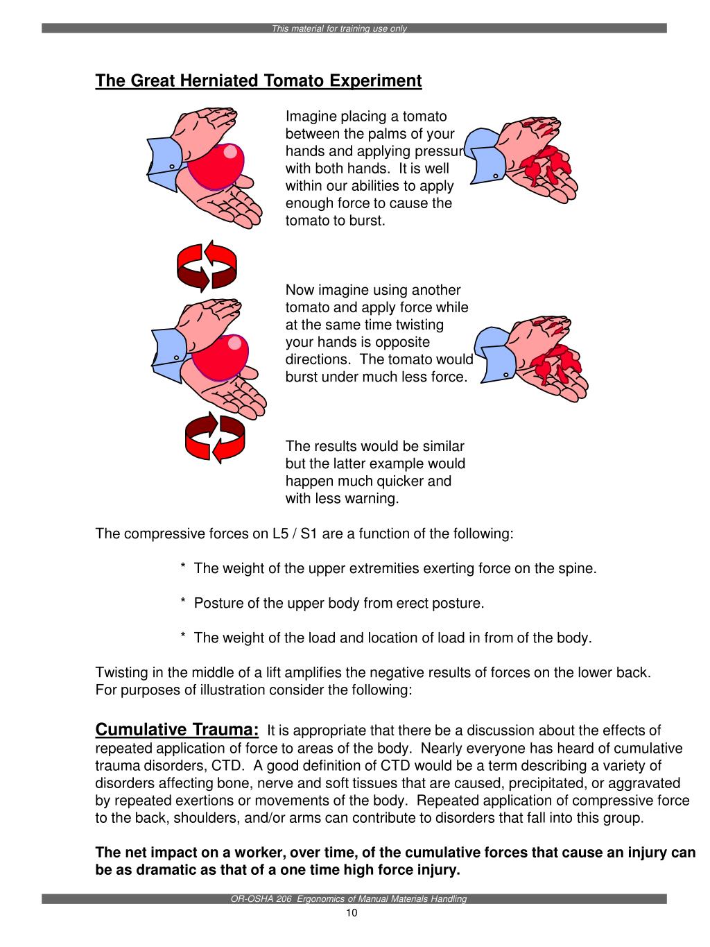 Imagine placing a tomato between the palms of your hands and applying pressure with both hands. It is well within our abilities to apply enough force to cause the tomato to burst. Now imagine using another tomato and apply force while at the same time twisting your hands is opposite directions. The tomato would burst under much less force. The results would be similar but the latter example would happen much quicker and with less warning. The Great Herniated Tomato Experiment The compressive forces on L5 / S1 are a function of the following: * The weight of the upper extremities exerting force on the spine. * Posture of the upper body from erect posture. * The weight of the load and location of load in from of the body. Twisting in the middle of a lift amplifies the negative results of forces on the lower back. For purposes of illustration consider the following: Cumulative Trauma: It is appropriate that there be a discussion about the effects of repeated application of force to areas of the body. Nearly everyone has heard of cumulative trauma disorders, CTD. A good definition of CTD would be a term describing a variety of disorders affecting bone, nerve and soft tissues that are caused, precipitated, or aggravated by repeated exertions or movements of the body. Repeated application of compressive force to the back, shoulders, and/or arms can contribute to disorders that fall into this group. The net impact on a worker, over time, of the cumulative forces that cause an injury can be as dramatic as that of a one time high force injury.