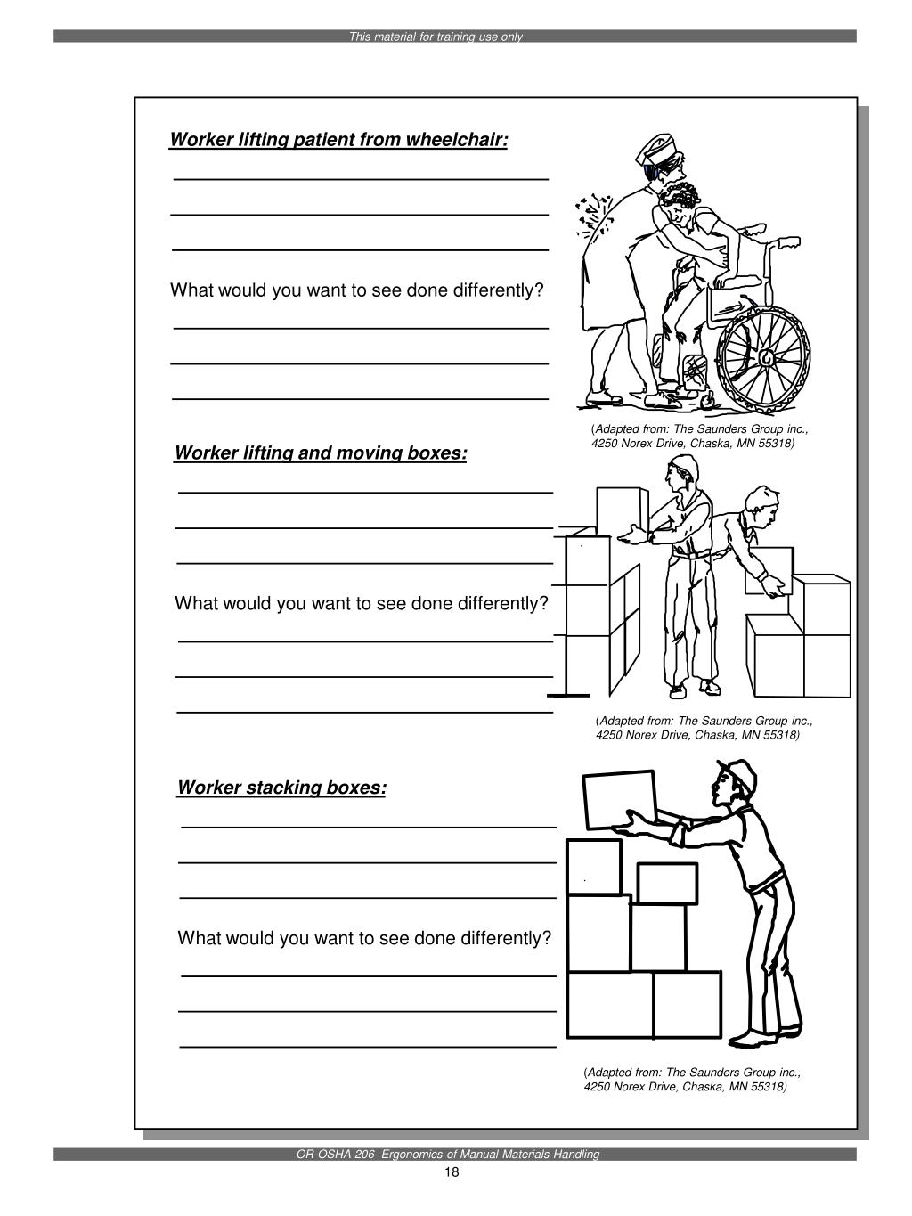 What would you want to see done differently? What would you want to see done differently? What would you want to see done differently? Worker lifting patient from wheelchair: (Adapted from: The Saunders Group inc., 4250 Norex Drive, Chaska, MN 55318) Worker lifting and moving boxes: (Adapted from: The Saunders Group inc., 4250 Norex Drive, Chaska, MN 55318) Worker stacking boxes: (Adapted from: The Saunders Group inc., 4250 Norex Drive, Chaska, MN 55318)
