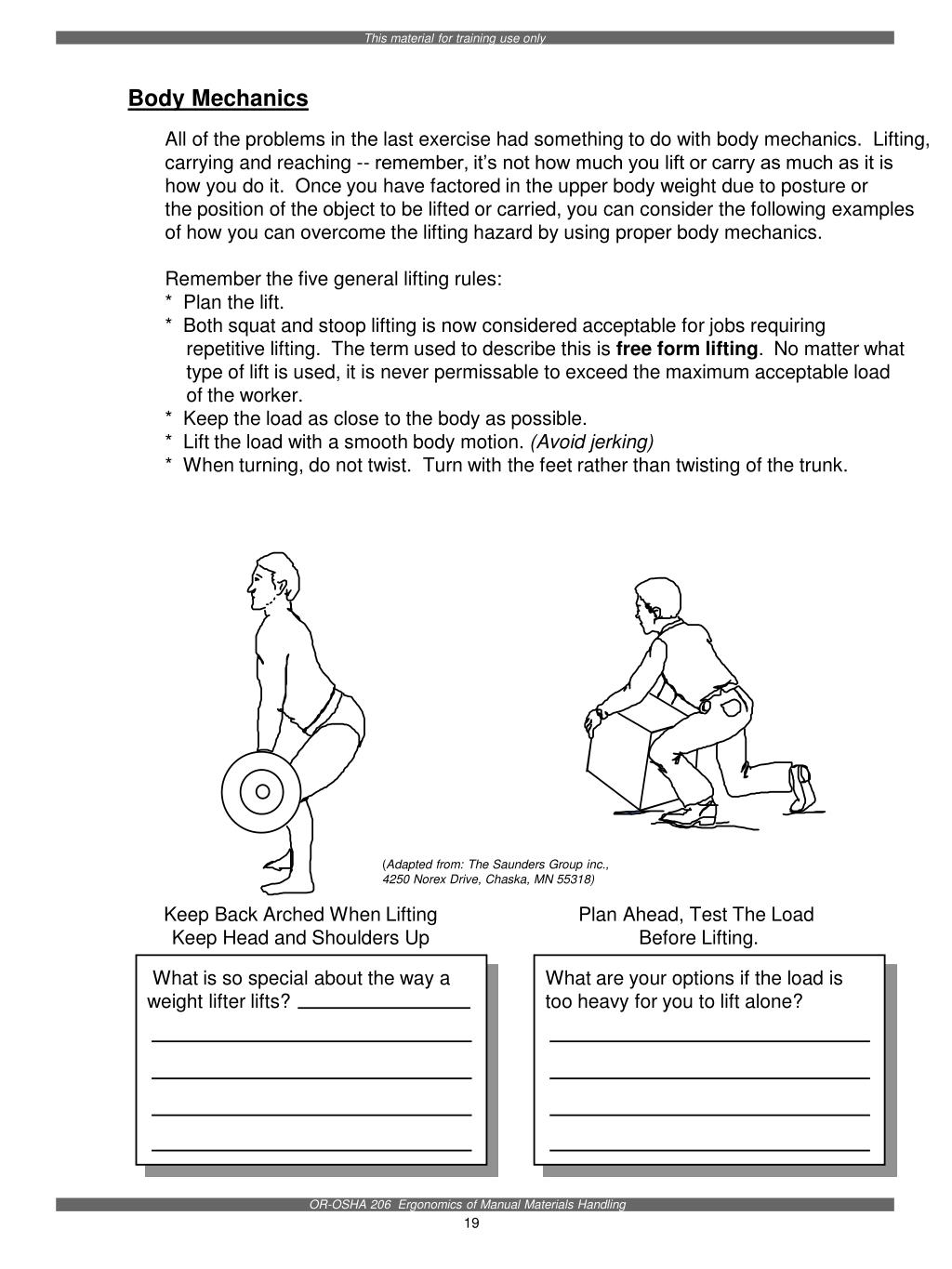 Body Mechanics All of the problems in the last exercise had something to do with body mechanics. Lifting, carrying and reaching -- remember, it’s not how much you lift or carry as much as it is how you do it. Once you have factored in the upper body weight due to posture or the position of the object to be lifted or carried, you can consider the following examples of how you can overcome the lifting hazard by using proper body mechanics. Remember the five general lifting rules: * Plan the lift. * Both squat and stoop lifting is now considered acceptable for jobs requiring repetitive lifting. The term used to describe this is free form lifting. No matter what type of lift is used, it is never permissable to exceed the maximum acceptable load of the worker. * Keep the load as close to the body as possible. * Lift the load with a smooth body motion. (Avoid jerking) * When turning, do not twist. Turn with the feet rather than twisting of the trunk. (Adapted from: The Saunders Group inc., 4250 Norex Drive, Chaska, MN 55318) Keep Back Arched When Lifting Keep Head and Shoulders Up Plan Ahead, Test The Load Before Lifting. What is so special about the way a weight lifter lifts? What are your options if the load is too heavy for you to lift alone?