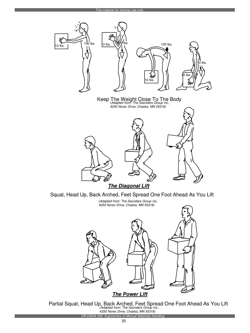 10 lbs. 100 lbs. 10 lbs. 100 lbs. 10 lbs. 10 lbs. 10 lbs. 10 lbs. Keep The Weight Close To The Body (Adapted from: The Saunders Group inc., 4250 Norex Drive, Chaska, MN 55318) The Diagonal Lift Squat, Head Up, Back Arched, Feet Spread One Foot Ahead As You Lift (Adapted from: The Saunders Group inc, 4250 Norex Drive, Chaska, MN 55318) The Power Lift Partial Squat, Head Up, Back Arched, Feet Spread One Foot Ahead As You Lift (Adapted from: The Saunders Group inc., 4250 Norex Drive, Chaska, MN 55318)
