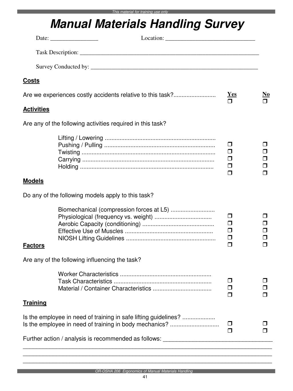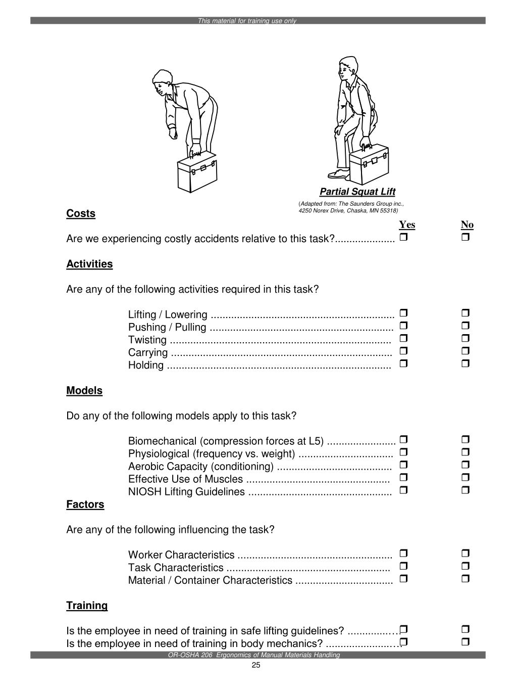 Costs Are we experiencing costly accidents relative to this task?..................... Activities Are any of the following activities required in this task? Lifting / Lowering ................................................................ Pushing / Pulling ................................................................ Twisting ............................................................................. Carrying ............................................................................. Holding .............................................................................. Models Do any of the following models apply to this task? Biomechanical (compression forces at L5) ........................ Physiological (frequency vs. weight) ................................. Aerobic Capacity (conditioning) ........................................ Effective Use of Muscles .................................................. NIOSH Lifting Guidelines .................................................. Factors Are any of the following influencing the task? Worker Characteristics ...................................................... Task Characteristics ......................................................... Material / Container Characteristics .................................. Training Is the employee in need of training in safe lifting guidelines? ..............…. Is the employee in need of training in body mechanics? ......................…. YesNo Back Unsupported (Adapted from: The Saunders Group inc., 4250 Norex Drive, Chaska, MN 55318)