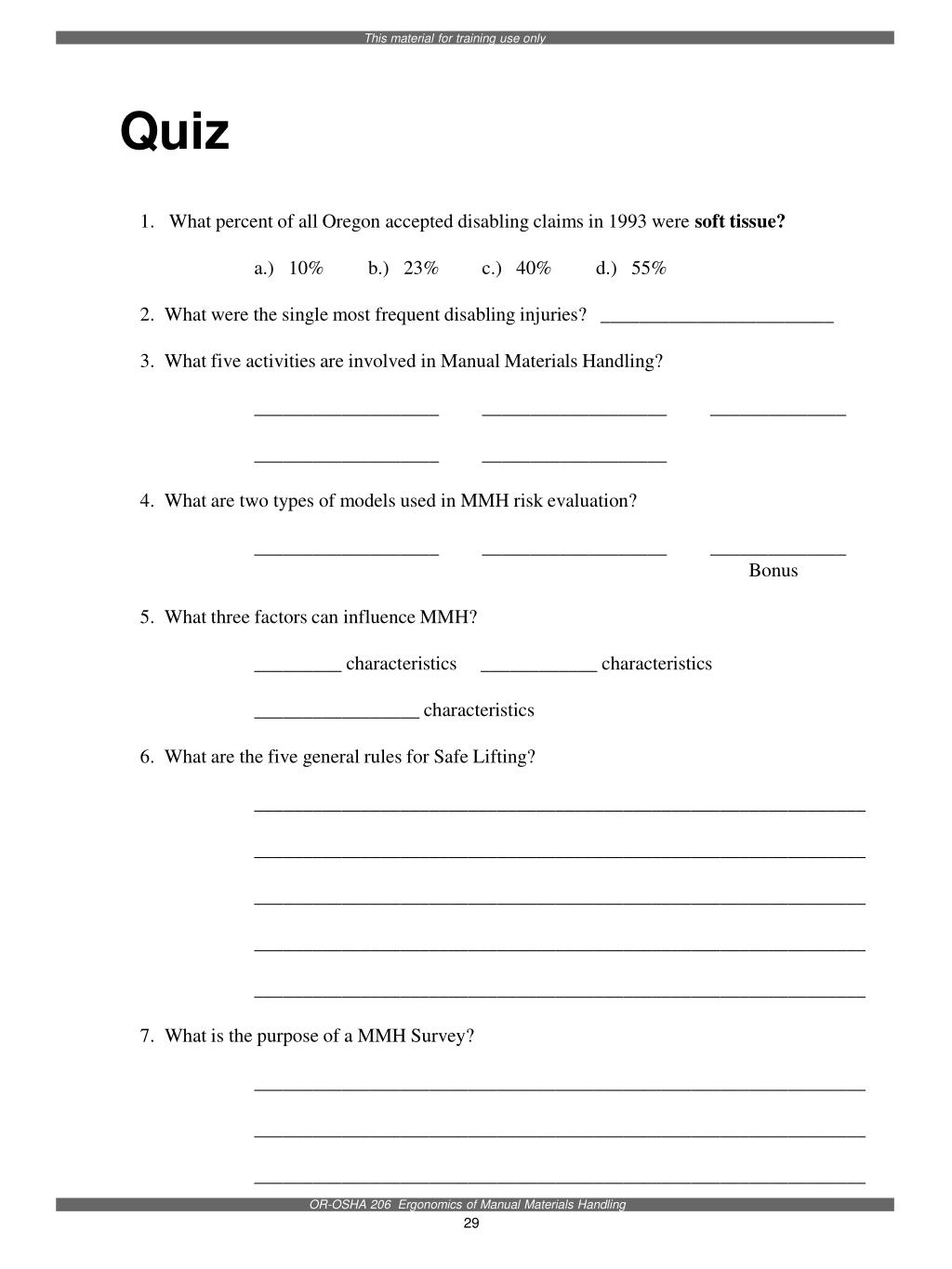 Quiz 1. What percent of all Oregon accepted disabling claims in 1993 were soft tissue? a.) 10% b.) 23% c.) 40% d.) 55% 2. What were the single most frequent disabling injuries? ________________________ 3. What five activities are involved in Manual Materials Handling? ___________________ ___________________ ______________ ___________________ ___________________ 4. What are two types of models used in MMH risk evaluation? ___________________ ___________________ ______________ Bonus 5. What three factors can influence MMH? _________ characteristics ____________ characteristics _________________ characteristics 6. What are the five general rules for Safe Lifting? _______________________________________________________________ _______________________________________________________________ _______________________________________________________________ _______________________________________________________________ _______________________________________________________________ 7. What is the purpose of a MMH Survey? _______________________________________________________________ _______________________________________________________________ _______________________________________________________________