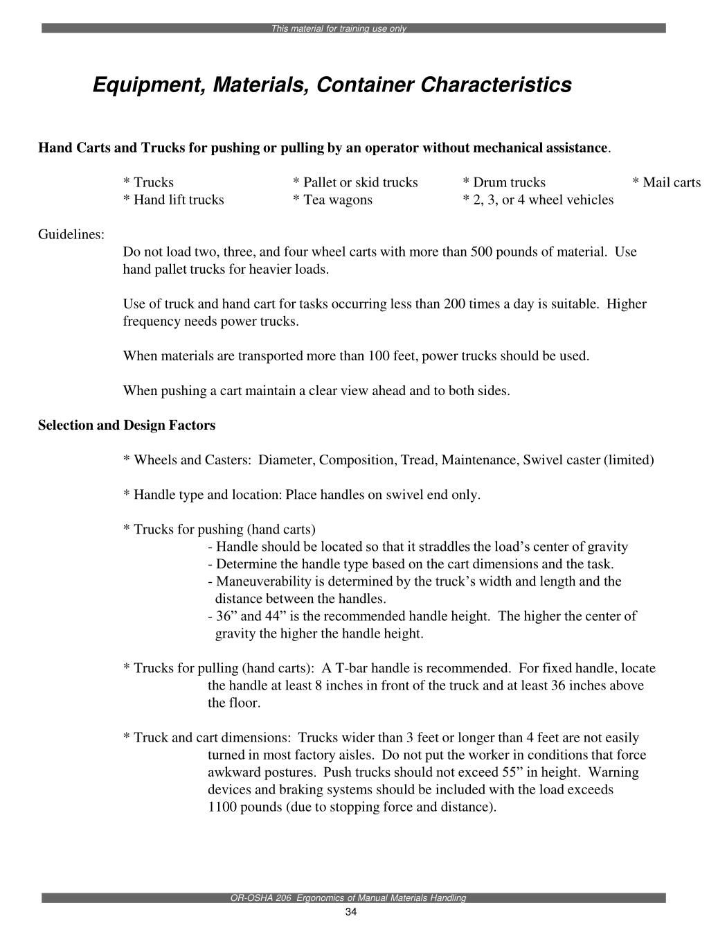 Equipment, Materials, Container Characteristics Hand Carts and Trucks for pushing or pulling by an operator without mechanical assistance. * Trucks * Pallet or skid trucks * Drum trucks * Mail carts * Hand lift trucks * Tea wagons * 2, 3, or 4 wheel vehicles Guidelines: Do not load two, three, and four wheel carts with more than 500 pounds of material. Use hand pallet trucks for heavier loads. Use of truck and hand cart for tasks occurring less than 200 times a day is suitable. Higher frequency needs power trucks. When materials are transported more than 100 feet, power trucks should be used. When pushing a cart maintain a clear view ahead and to both sides. Selection and Design Factors * Wheels and Casters: Diameter, Composition, Tread, Maintenance, Swivel caster (limited) * Handle type and location: Place handles on swivel end only. * Trucks for pushing (hand carts) - Handle should be located so that it straddles the load’s center of gravity - Determine the handle type based on the cart dimensions and the task. - Maneuverability is determined by the truck’s width and length and the distance between the handles. - 36” and 44” is the recommended handle height. The higher the center of gravity the higher the handle height. * Trucks for pulling (hand carts): A T-bar handle is recommended. For fixed handle, locate the handle at least 8 inches in front of the truck and at least 36 inches above the floor. * Truck and cart dimensions: Trucks wider than 3 feet or longer than 4 feet are not easily turned in most factory aisles. Do not put the worker in conditions that force awkward postures. Push trucks should not exceed 55” in height. Warning devices and braking systems should be included with the load exceeds 1100 pounds (due to stopping force and distance).
