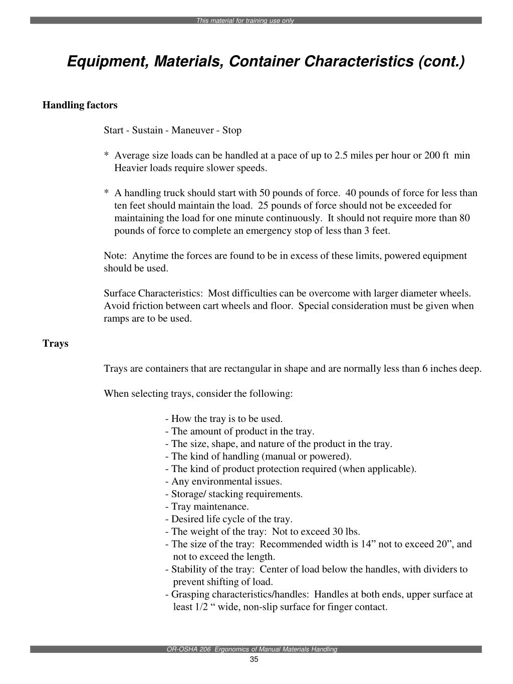 Equipment, Materials, Container Characteristics (cont.) Handling factors Start - Sustain - Maneuver - Stop * Average size loads can be handled at a pace of up to 2.5 miles per hour or 200 ft min Heavier loads require slower speeds. * A handling truck should start with 50 pounds of force. 40 pounds of force for less than ten feet should maintain the load. 25 pounds of force should not be exceeded for maintaining the load for one minute continuously. It should not require more than 80 pounds of force to complete an emergency stop of less than 3 feet. Note: Anytime the forces are found to be in excess of these limits, powered equipment should be used. Surface Characteristics: Most difficulties can be overcome with larger diameter wheels. Avoid friction between cart wheels and floor. Special consideration must be given when ramps are to be used. Trays Trays are containers that are rectangular in shape and are normally less than 6 inches deep. When selecting trays, consider the following: - How the tray is to be used. - The amount of product in the tray. - The size, shape, and nature of the product in the tray. - The kind of handling (manual or powered). - The kind of product protection required (when applicable). - Any environmental issues. - Storage/ stacking requirements. - Tray maintenance. - Desired life cycle of the tray. - The weight of the tray: Not to exceed 30 lbs. - The size of the tray: Recommended width is 14” not to exceed 20”, and not to exceed the length. - Stability of the tray: Center of load below the handles, with dividers to prevent shifting of load. - Grasping characteristics/handles: Handles at both ends, upper surface at least 1/2 “ wide, non-slip surface for finger contact.