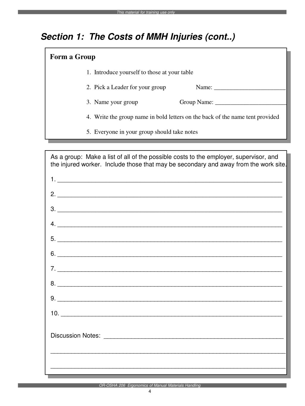 Section 1: The Costs of MMH Injuries (cont..) Form a Group 1. Introduce yourself to those at your table 2. Pick a Leader for your group Name: _______________________ 3. Name your group Group Name: _______________________ 4. Write the group name in bold letters on the back of the name tent provided 5. Everyone in your group should take notes As a group: Make a list of all of the possible costs to the employer, supervisor, and the injured worker. Include those that may be secondary and away from the work site. 1. _________________________________________________________________ 2. _________________________________________________________________ 3. _________________________________________________________________ 4. _________________________________________________________________ 5. _________________________________________________________________ 6. _________________________________________________________________ 7. _________________________________________________________________ 8. _________________________________________________________________ 9. _________________________________________________________________ 10. ________________________________________________________________ Discussion Notes: ____________________________________________________ ____________________________________________________________________ ____________________________________________________________________