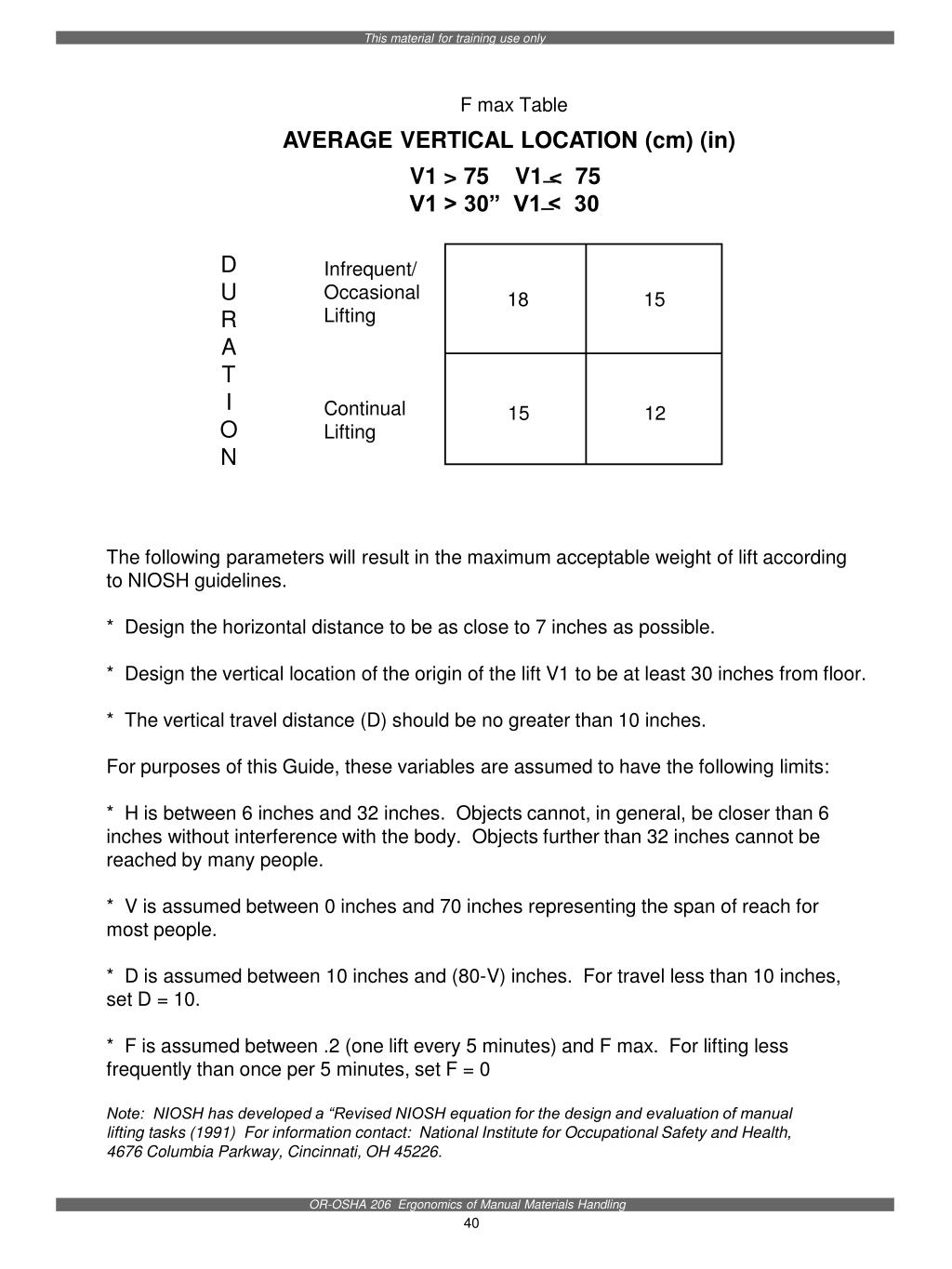 F max Table AVERAGE VERTICAL LOCATION (cm) (in) V1 > 75 V1 < 75 V1 > 30” V1 < 30 D U R A T I O N Infrequent/ Occasional Lifting Continual Lifting 18 15 15 12 The following parameters will result in the maximum acceptable weight of lift according to NIOSH guidelines. * Design the horizontal distance to be as close to 7 inches as possible. * Design the vertical location of the origin of the lift V1 to be at least 30 inches from floor. * The vertical travel distance (D) should be no greater than 10 inches. For purposes of this Guide, these variables are assumed to have the following limits: * H is between 6 inches and 32 inches. Objects cannot, in general, be closer than 6 inches without interference with the body. Objects further than 32 inches cannot be reached by many people. * V is assumed between 0 inches and 70 inches representing the span of reach for most people. * D is assumed between 10 inches and (80-V) inches. For travel less than 10 inches, set D = 10. * F is assumed between .2 (one lift every 5 minutes) and F max. For lifting less frequently than once per 5 minutes, set F = 0 Note: NIOSH has developed a “Revised NIOSH equation for the design and evaluation of manual lifting tasks (1991) For information contact: National Institute for Occupational Safety and Health, 4676 Columbia Parkway, Cincinnati, OH 45226.