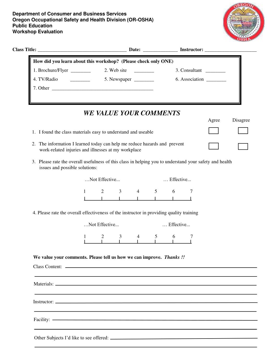 WE VALUE YOUR COMMENTS Agree Disagree 1. I found the class materials easy to understand and useable 2. The information I learned today can help me reduce hazards and prevent work-related injuries and illnesses at my workplace 3. Please rate the overall usefulness of this class in helping you to understand your safety and health issues and possible solutions: …Not Effective... … Effective... 1 2 3 4 5 6 7 4. Please rate the overall effectiveness of the instructor in providing quality training …Not Effective... … Effective... 1 2 3 4 5 6 7 We value your comments. Please tell us how we can improve. Thanks !! Class Content: Materials: Instructor: Facility: Other Subjects I’d like to see offered: Department of Consumer and Business Services Oregon Occupational Safety and Health Division (OR-OSHA) Public Education Workshop Evaluation Class Title: ____________________________________ Date: ______________ Instructor: _____________________ How did you learn about this workshop? (Please check only ONE) 1. Brochure/Flyer ________ 2. Web site ________ 3. Consultant ________ 4. TV/Radio ________ 5. Newspaper ________ 6. Association ________ 7. Other _________________________________________