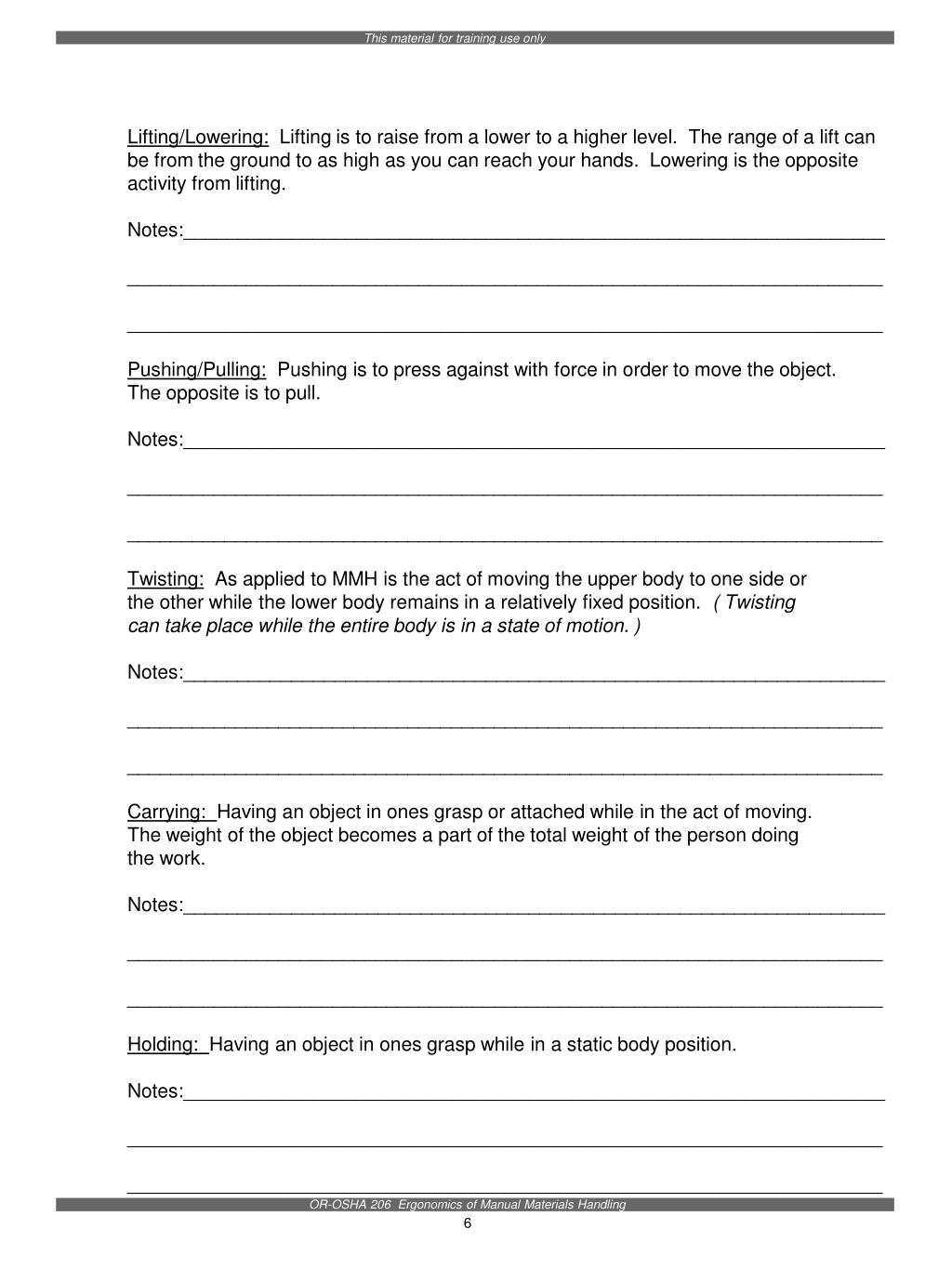 Lifting/Lowering: Lifting is to raise from a lower to a higher level. The range of a lift can be from the ground to as high as you can reach your hands. Lowering is the opposite activity from lifting. Notes:_________________________________________________________________ ______________________________________________________________________ ______________________________________________________________________ Pushing/Pulling: Pushing is to press against with force in order to move the object. The opposite is to pull. Notes:_________________________________________________________________ ______________________________________________________________________ ______________________________________________________________________ Twisting: As applied to MMH is the act of moving the upper body to one side or the other while the lower body remains in a relatively fixed position. ( Twisting can take place while the entire body is in a state of motion. ) Notes:_________________________________________________________________ ______________________________________________________________________ ______________________________________________________________________ Carrying: Having an object in ones grasp or attached while in the act of moving. The weight of the object becomes a part of the total weight of the person doing the work. Notes:_________________________________________________________________ ______________________________________________________________________ ______________________________________________________________________ Holding: Having an object in ones grasp while in a static body position. Notes:_________________________________________________________________ ______________________________________________________________________ ______________________________________________________________________