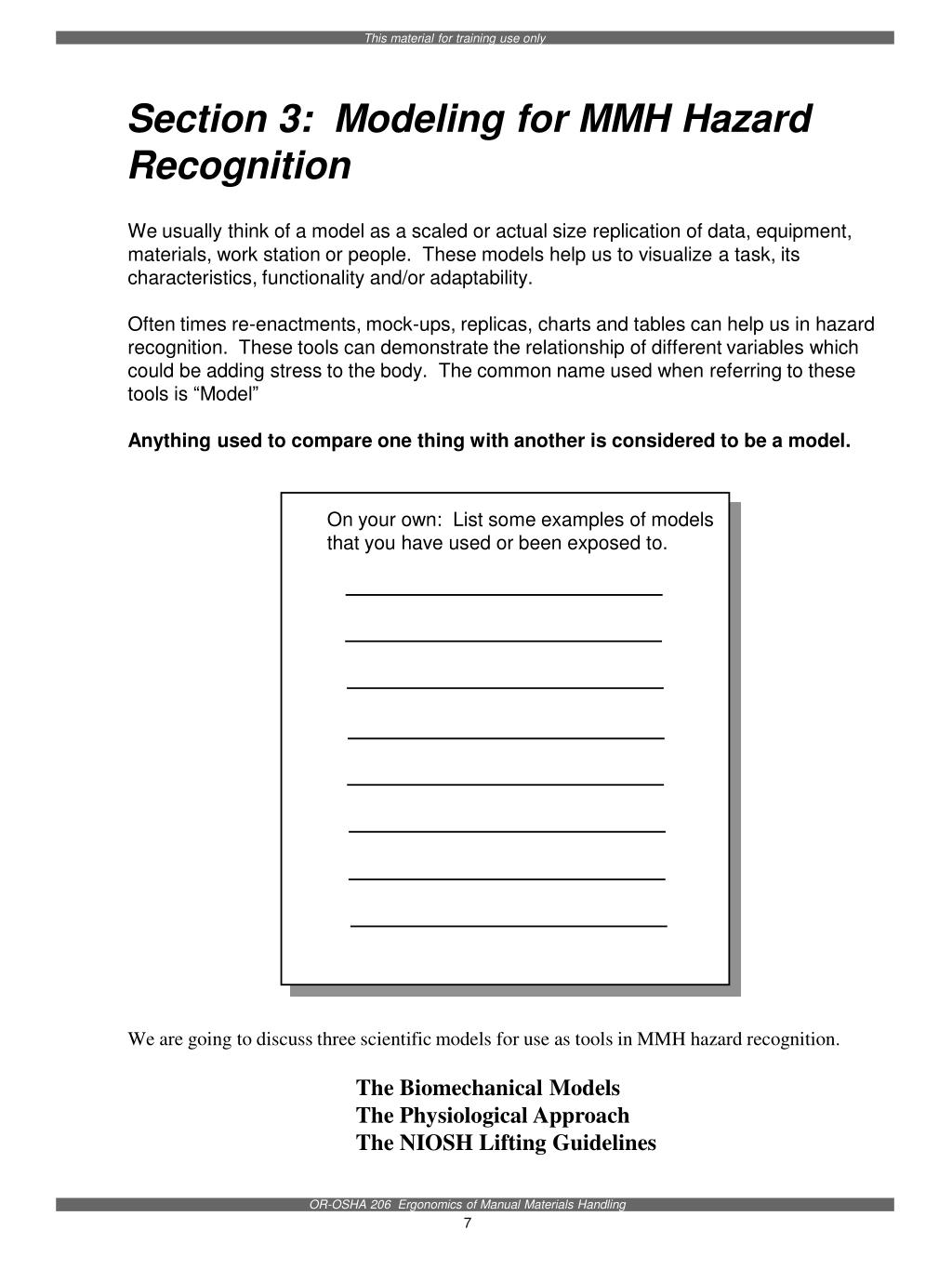 On your own: List some examples of models that you have used or been exposed to. Section 3: Modeling for MMH Hazard Recognition We usually think of a model as a scaled or actual size replication of data, equipment, materials, work station or people. These models help us to visualize a task, its characteristics, functionality and/or adaptability. Often times re-enactments, mock-ups, replicas, charts and tables can help us in hazard recognition. These tools can demonstrate the relationship of different variables which could be adding stress to the body. The common name used when referring to these tools is “Model” Anything used to compare one thing with another is considered to be a model. We are going to discuss three scientific models for use as tools in MMH hazard recognition. The Biomechanical Models The Physiological Approach The NIOSH Lifting Guidelines